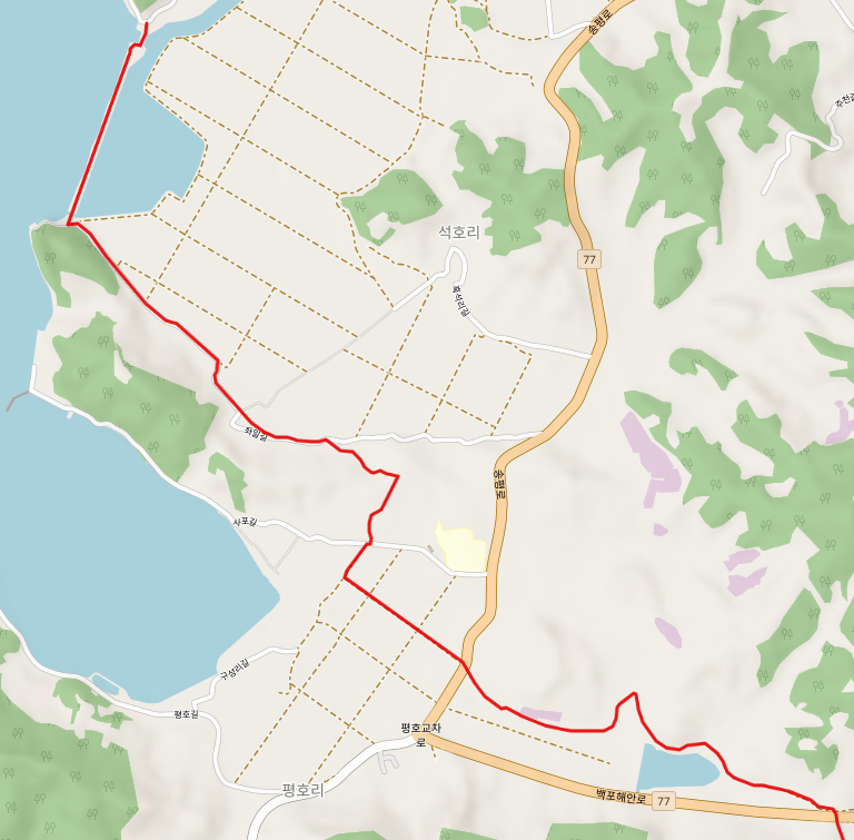송지면 마봉리에서 소죽리로 들어선 길은 송지 초등학교를 지나 송지면사무소 앞에서 여정을 마무리한다. 1코스를 끝내면 2코스 7.9 Km 정도를 더 걷는다. 면사무소 인근에 마트와 편의점, 식당이 있다.