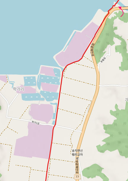 북쪽으로 이동하다 보면 학가리 땅끝 염전을(6.6Km) 지나는데 지금은 대부분 태양광 발전 단지로 바뀐 상태이다. 길은 송지면 가차리에서 송지천을 건너 군곡리로 넘어가는데 오늘은 송지천을 건너는 송암교 앞에서 여정을 마무리하고 송암 버스 정류장에서 해남 읍내로 이동하여 하룻밤 쉬어간다. 이곳은 해남에서 금강, 산정을 거쳐 어란, 사구로 가는 버스들이 모두 정차하는 곳이라서 해남으로 이동하기에도, 내일 해남에서 이곳으로 이동하기에도 용이하다. 군청에 있는 해남 출발 기준 시간표는 아래와 같다.