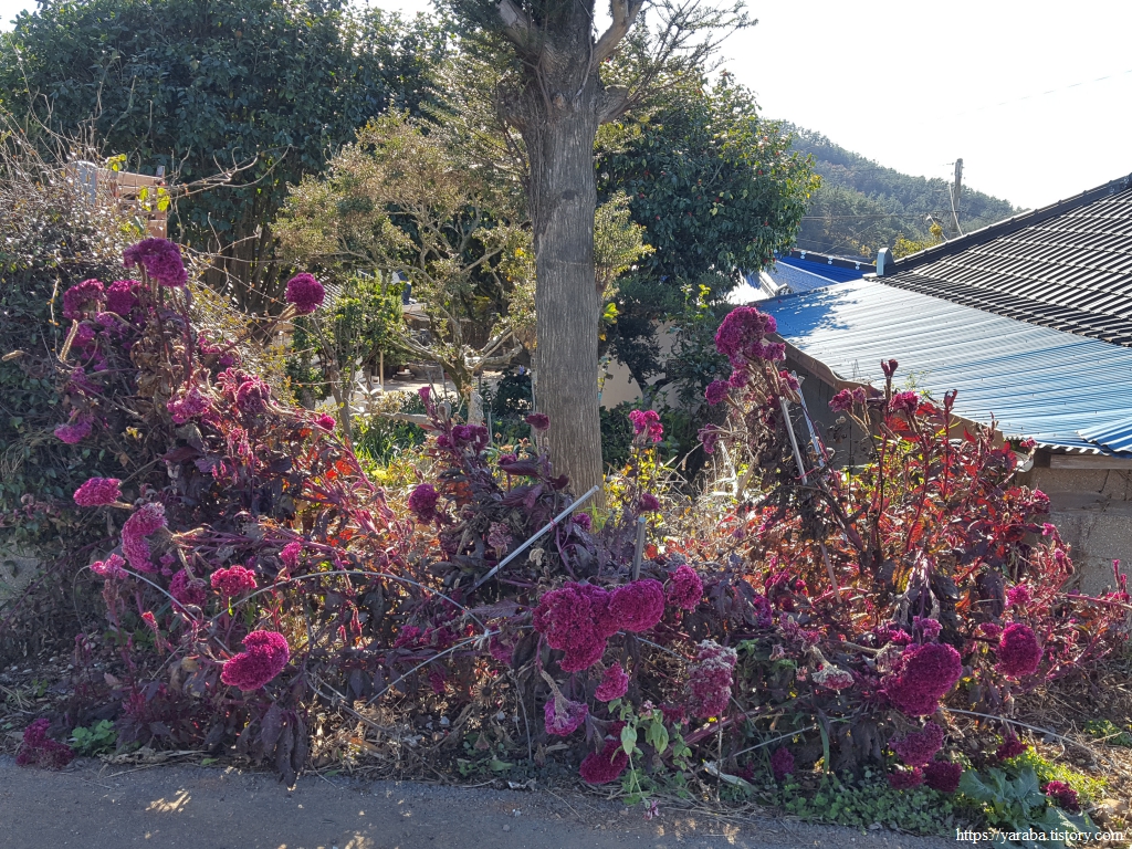 한 집 앞에 심은 맨드라미가 인상적이다. 닭의 벼슬처럼 생겼다고 닭벼슬꽃이라는 별칭도 있다. 옆지기 말대로 꽃도 검은 씨앗도 약으로 쓴다고 한다.