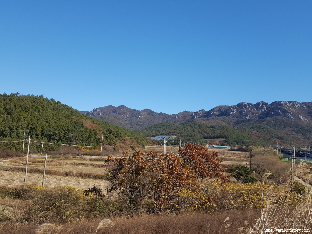 고개를 넘어 마봉리로 넘어서니 이 한적한 산길을 해남 버스가 조용히 지나간다. 우리도 놀랐지만 버스 기사분도 한적한 산길을 걷는 사람을 만나니 조금은 놀라시지 않았을까 싶다. 우측으로는 달마산 자락이 시야에 들어오기 시작한다. 높지 않은 바위산이 아름답다.