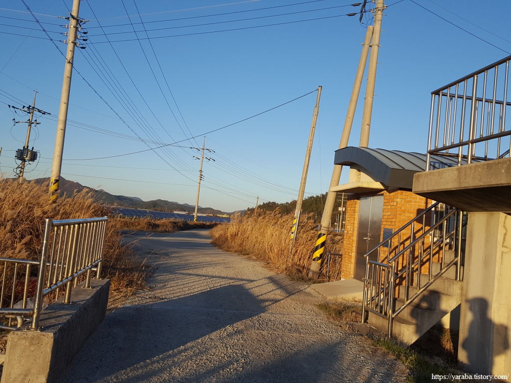우근리 들판을 지나 학가리 들판을 지나는 길은 태양광 패널과 함께 하는 길이다. 일제강점기 우근방조제와 백포만방조제가 만들어지면서 많은 농지와 염전이 생겼는데 그중에 대부분의 염전이 사라지고 그 자리에 그림처럼 태양광 발전소가 들어섰다. 해남이 일조량이 풍부한 지역이다 보니 발전 효율이 높다고 한다. 2021년 에너지 공단 통계를 보면 전남지역의 태양광 발전이 전국에서 단연 1위를 보이고 있다. 그리고 전남 지역에서도 해남군이 단연 1위의 태양광 발전량을 보이고 있고 계속 늘어나고 있는 추세라고 한다. 해남에 수도권에 몰려있는 데이터센터를 구축해서 재생에너지를 공급할 계획이라는 뉴스도 있다.