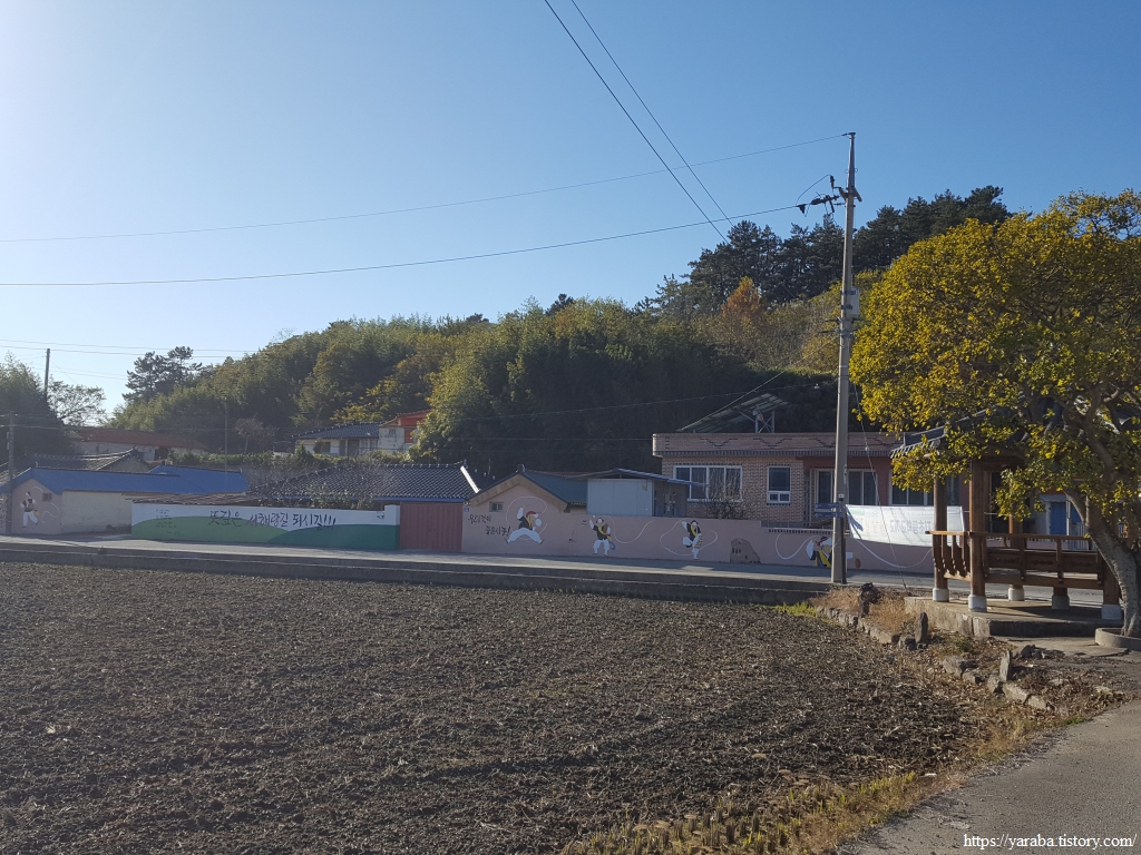 산정천을 건너면 굴다리를 통해 77번 국도 땅끝해안로를 가로질러 미학마을로 들어간다. 미학마을은 예전에는 미역섬, 미도로 불렸던 섬으로 일제강점기 우근방조제가 생기며 육지화되었다고 한다. 멀리에서도 보일 정도로 마을 벽화에 "뜻깊은 서해랑길 되시길!!!" 하는 문구를 적어 놓았다. 어찌 보면 시끄럽고, 귀찮은 나그네일 뿐인데 참 고마운 마음을 가진 마을이다 하는 생각이 들었다.