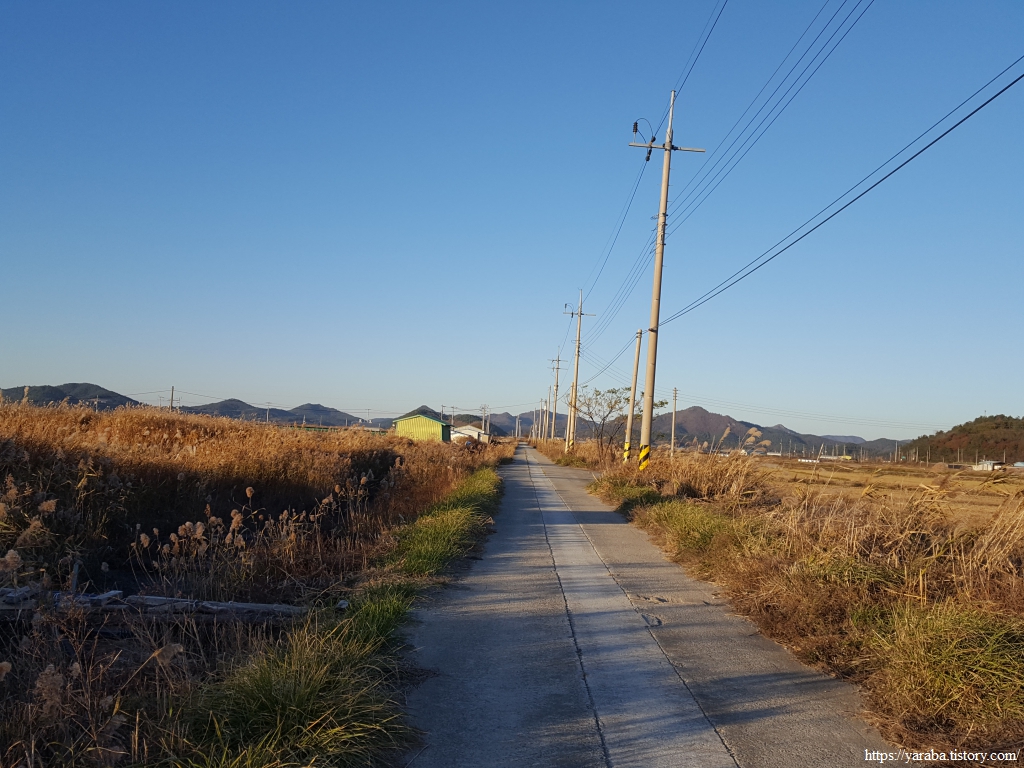 서해랑길 1코스를 끝내면 2코스의 절반 정도(8Km)를 더 걷는다. 읍내를 빠져나가 미학리를 지나 산정천을 건너 천변 둑방길을 따라 해변으로 나갔다가 우근리와 학가리의 들판을 북쪽으로 가로질러 송암마을에 이른다. 완만한 평야지대가 이어진다.