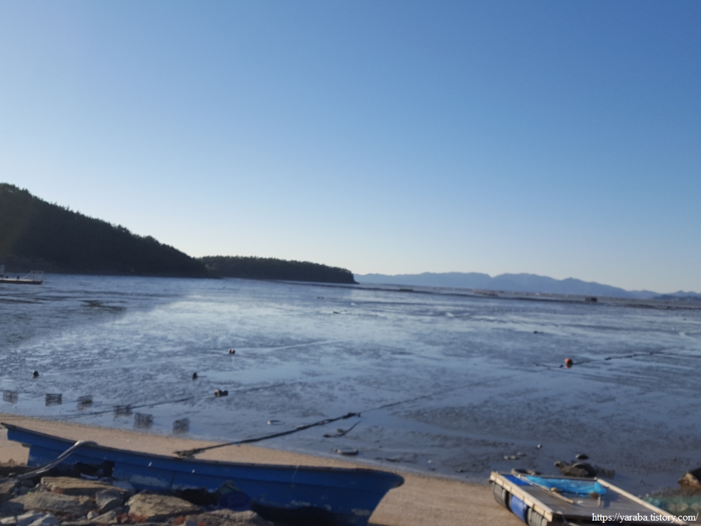 마을에서 나온 길은 들판을 가로질러 우근 방조제로 향한다. 썰물 때라 물이 빠져서 넓은 갯벌이 드러났다.