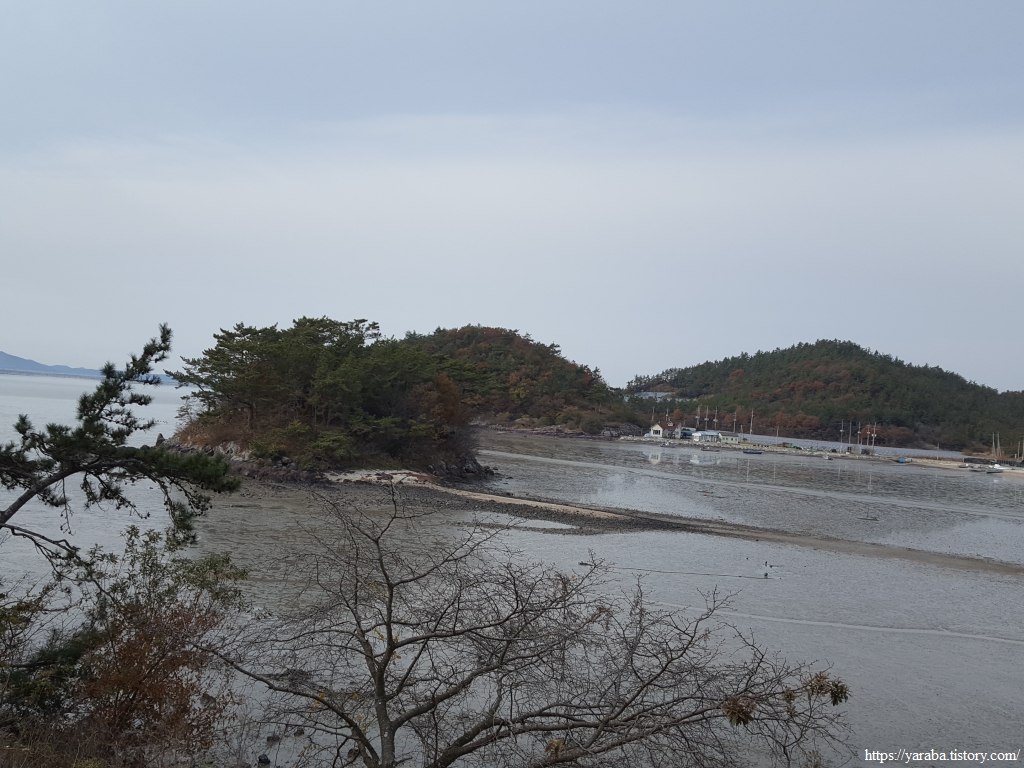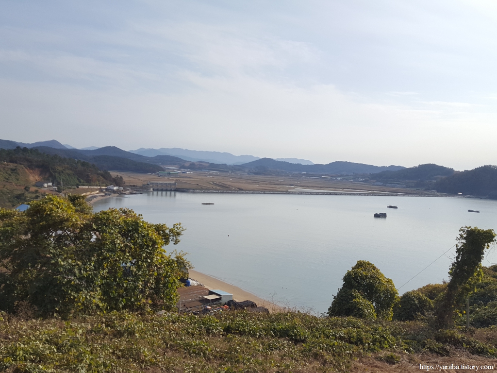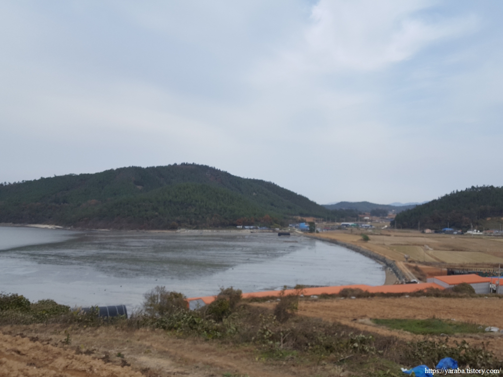 어느 정도 오르막을 올라서 바라본 관두산 앞바다의 전경이다. 관동방조제가 없었다면 내륙 깊이 까지 바닷물이 들어갔을 풍경이다.