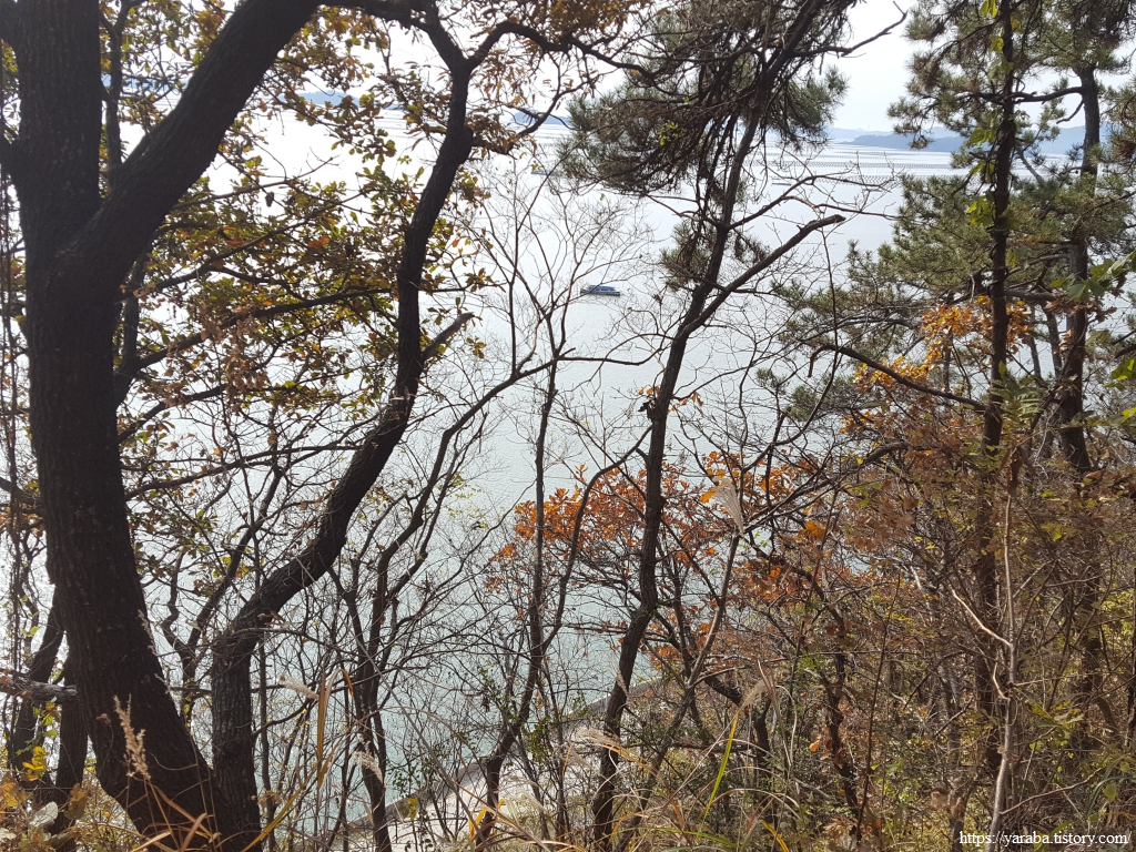 길지 않은 대월산 자락의 임도는 가좌리 앞바다의 작은 섬을 보이면서 끝이 난다.