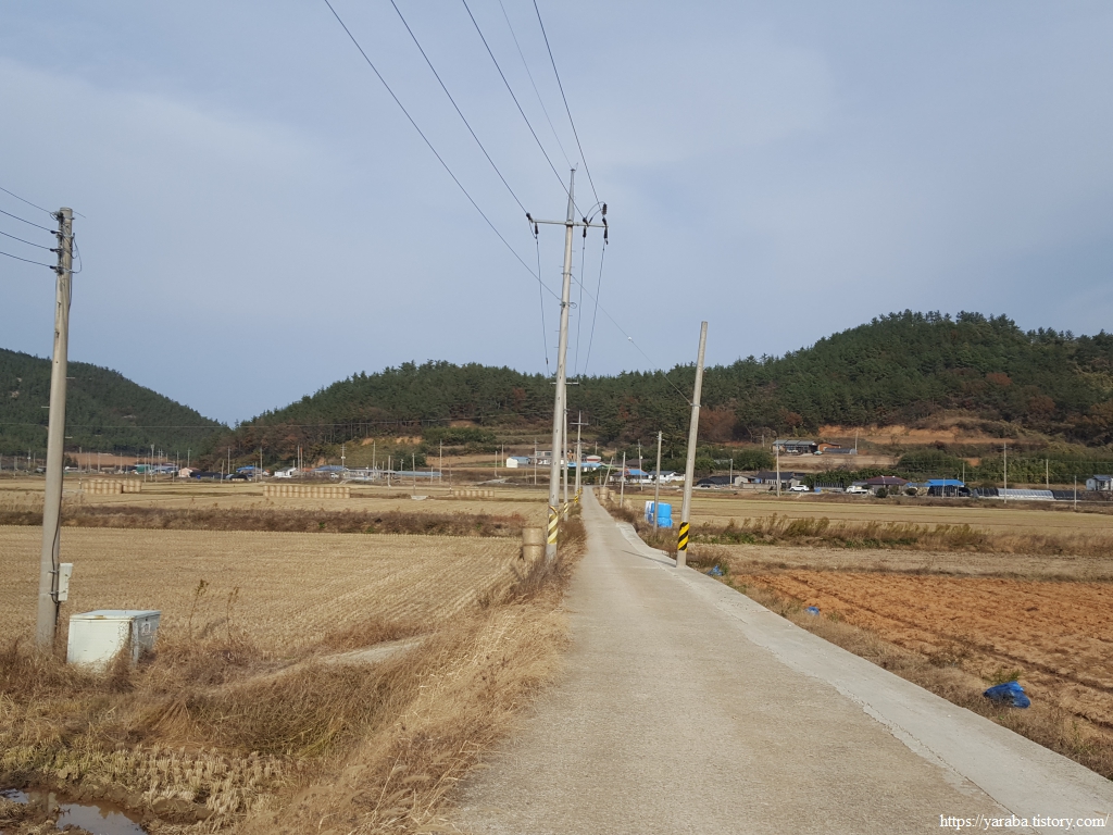 예전에는 임도에서 내려오면 바로 좌회전하여 명성마을 앞 해안길로 직진한 모양인데 지금은 농로를 통해서 돌아가도록 경로가 바뀌었다. 아무래도 해안가에 있는 농업회사의 작업 반경과 경로가 겹치면서 공장도 걷는 사람도 상호 위험하기 때문이 아닌가 싶다. 공장을 우회해서 논 사이의 농로를 걷는데 한 농민이 경운기에 짚 더미를 잔뜩 싣고 옮기고 있었다. 집에서 소를 키우시는 모양인데 트랙터로 짚을 모아서 원형베일러로 만들어 놓는 요즘 세상에 그 흔한 노끈 하나 쓰시지 않고 볏짚으로 끈을 엮어서 짚단을 묶어 경운기로 나르시는 모습을 보니 자연스레 존경심이 들며 엄지를 들게 된다.