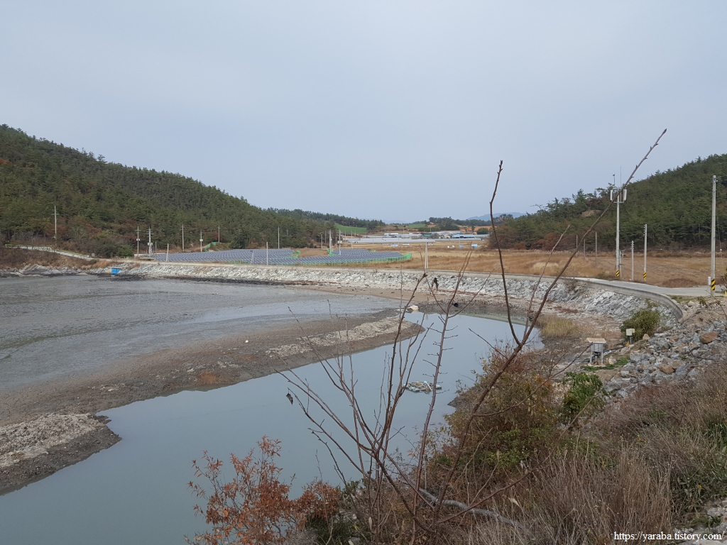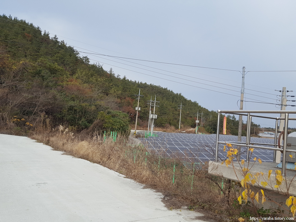 임도를 내려오면 해안 둑방길을 지나 우회전하여 산 자락 아래로 이어지는 태양광 발전소 사이의 길을 따라 가좌 마을로 향한다.