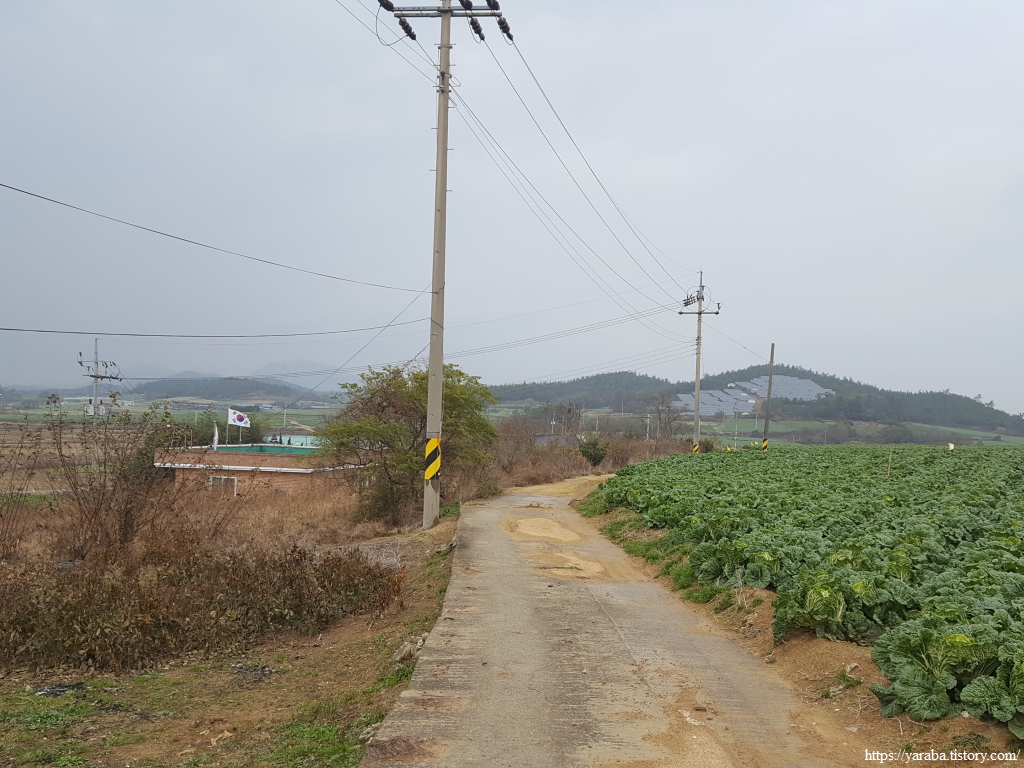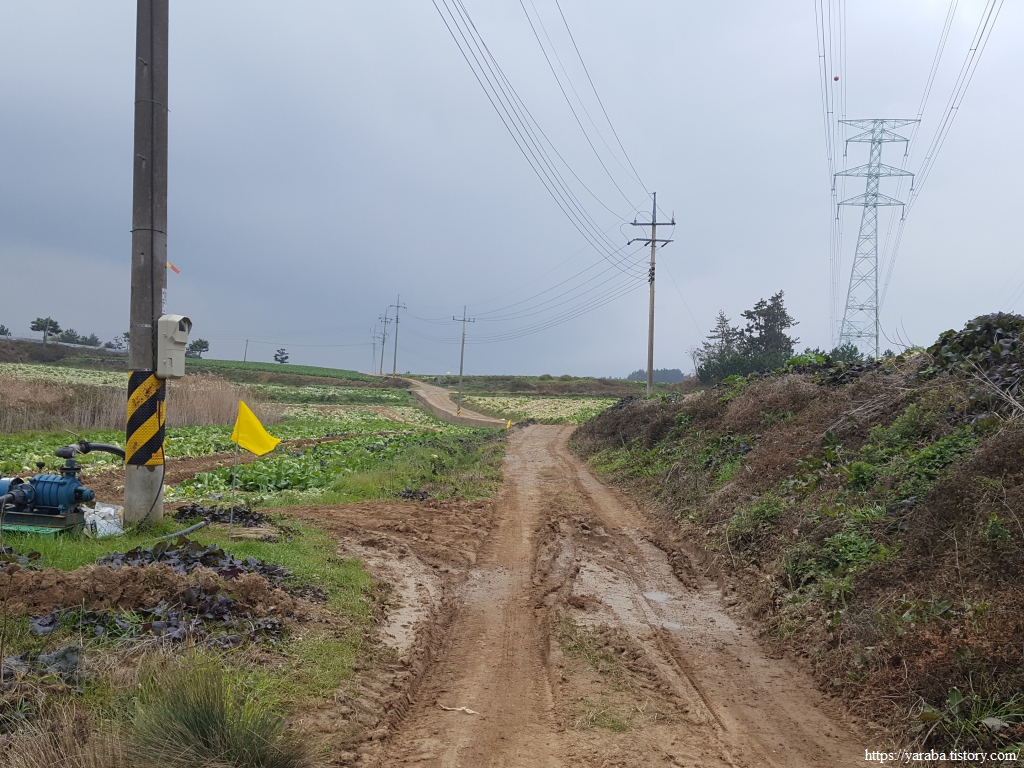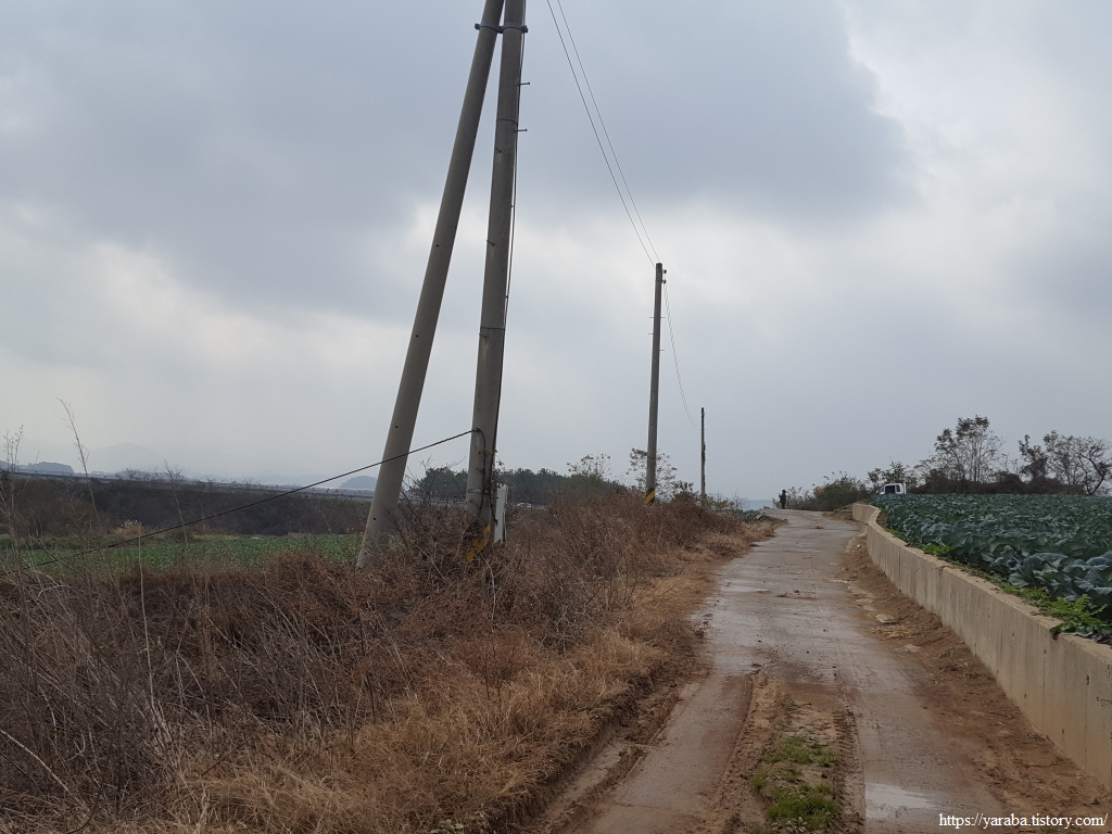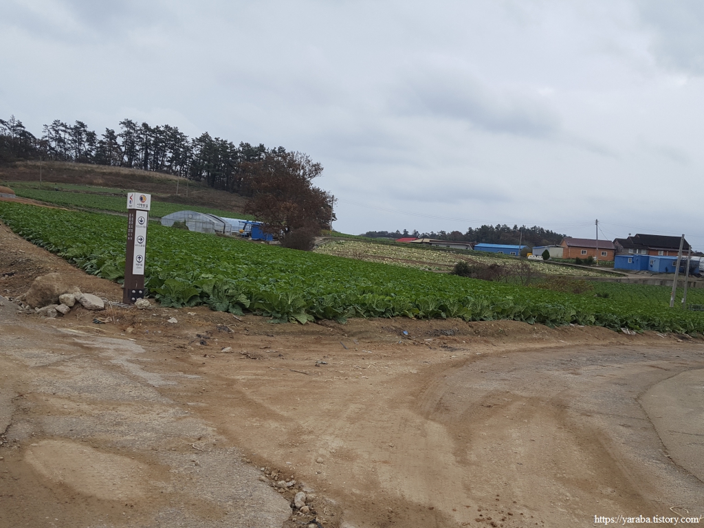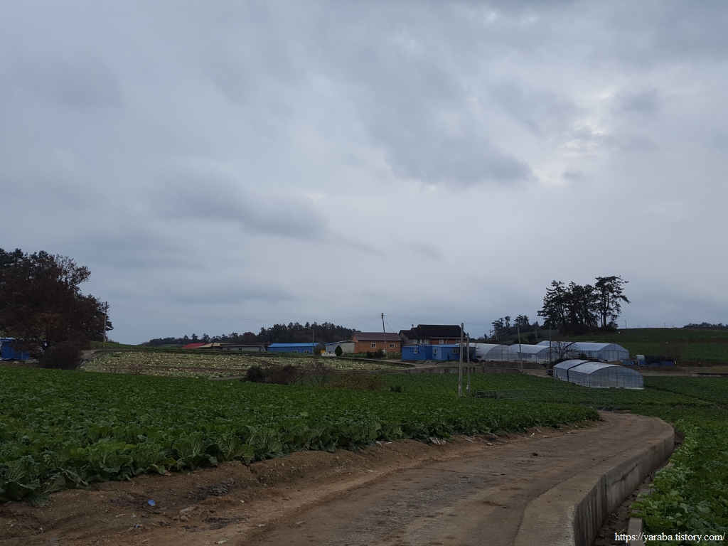 배추 수확철에 비까지 내리니 콘크리트 농로는 황토투성이가 되었다. 배추 수확이 끝난 밭에는 트럭이 힘겹게 들어갔다가 나온 흔적이 역력하다. 덕분에 우리는 신발에 달라붙은 흙을 털어내느라 가다 멈추었다를 반복한다.