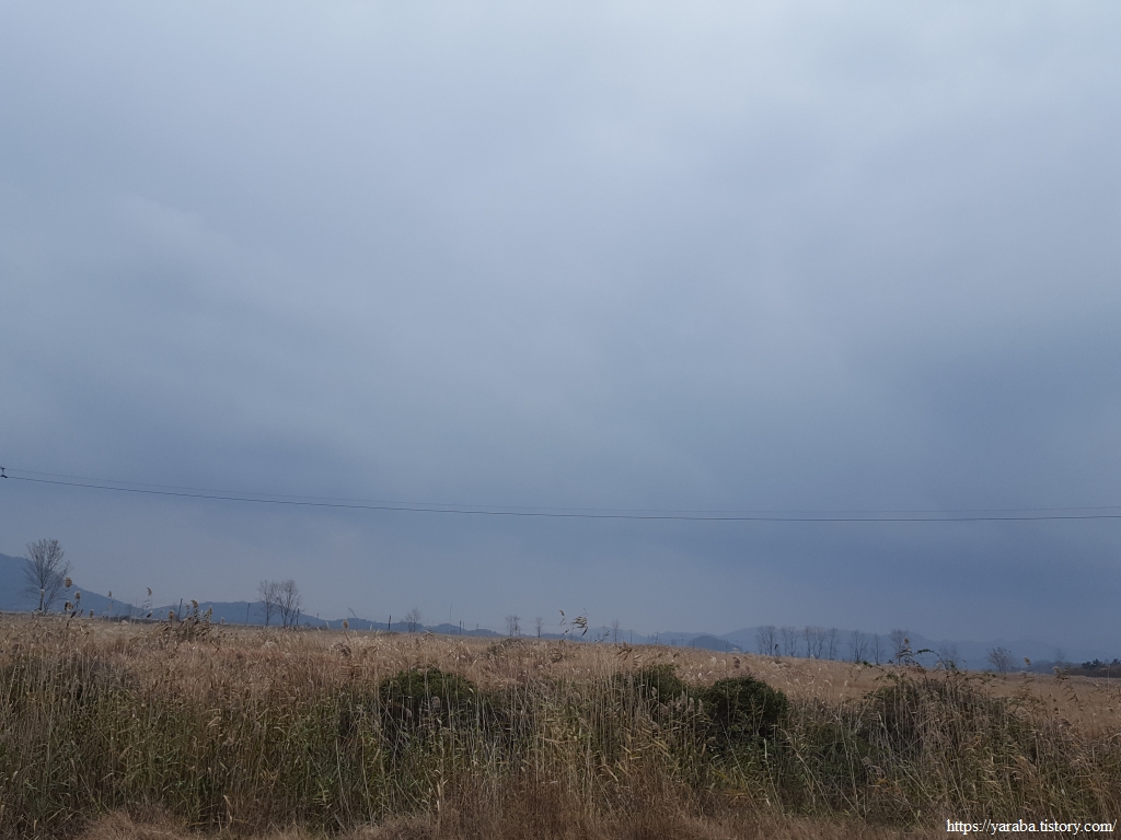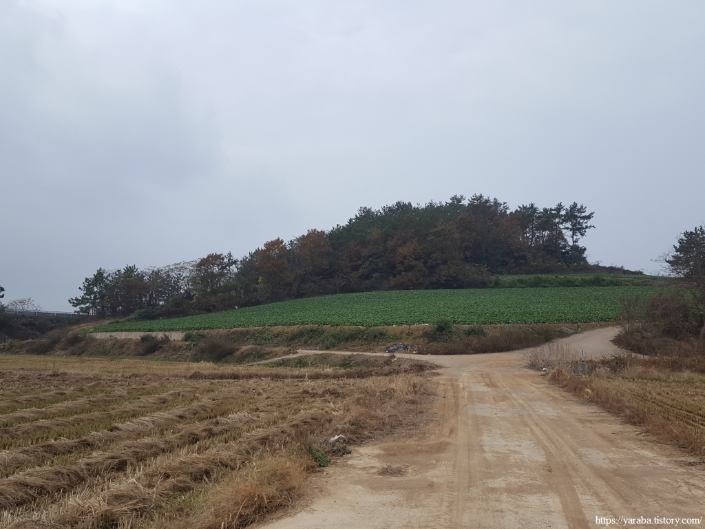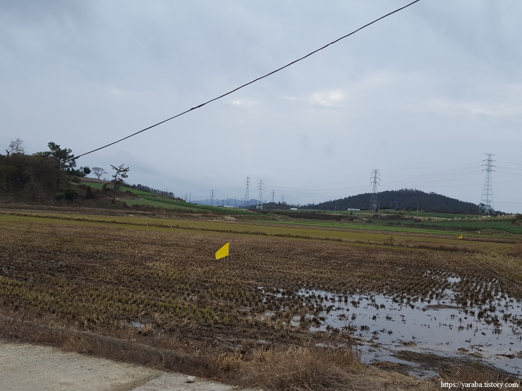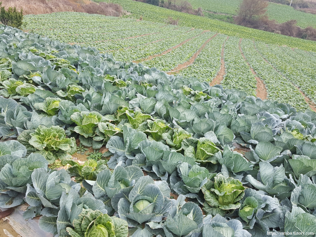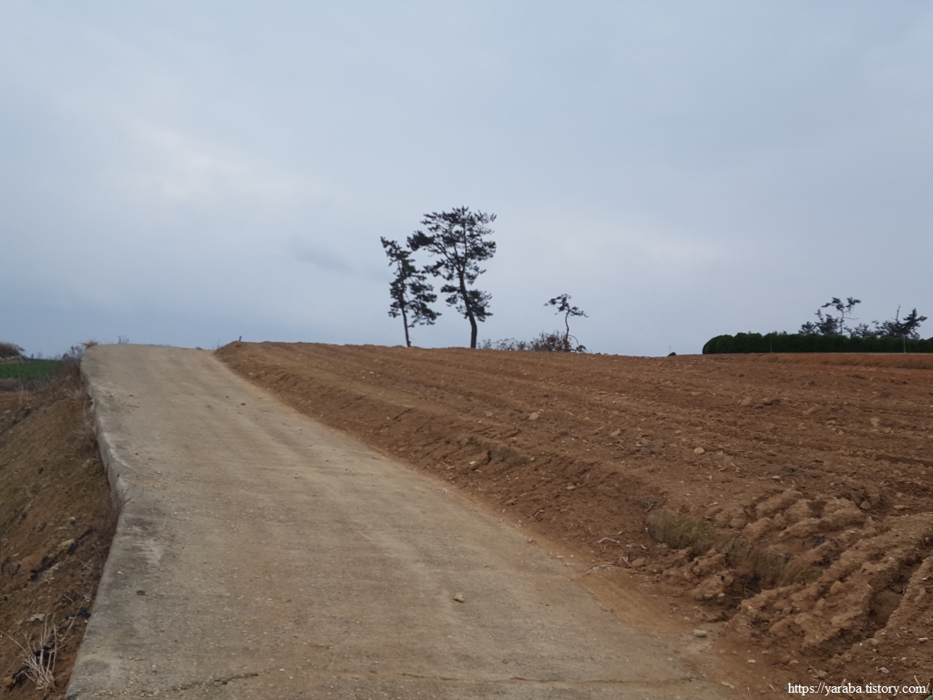 배추 수확철에 비까지 내리니 콘크리트 농로는 황토투성이가 되었다. 배추 수확이 끝난 밭에는 트럭이 힘겹게 들어갔다가 나온 흔적이 역력하다. 덕분에 우리는 신발에 달라붙은 흙을 털어내느라 가다 멈추었다를 반복한다.