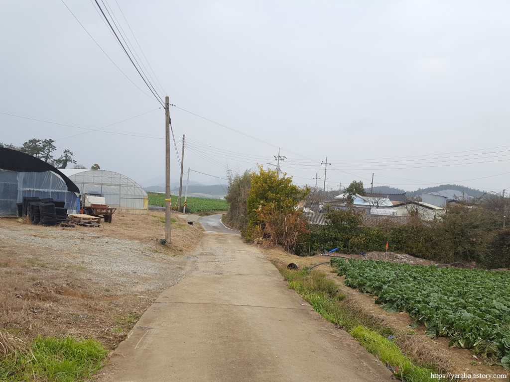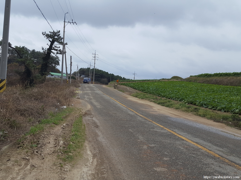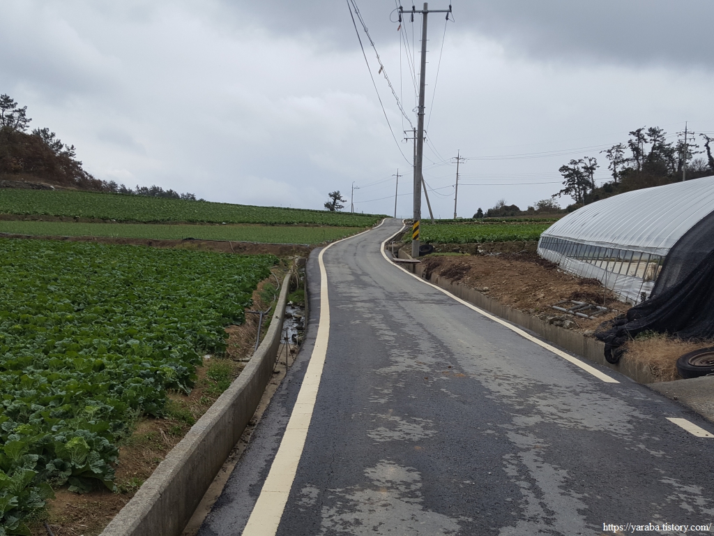 용암마을을 지나며 명량로 도로를 가로질러 계속 서쪽으로 이동한다. 구릉지의 밭들을 지나므로 배추를 원 없이 보며 걷는 길이다.