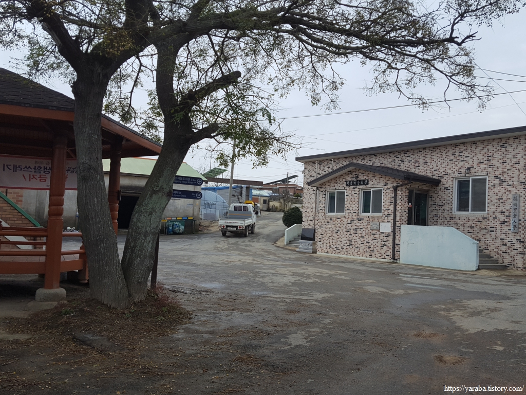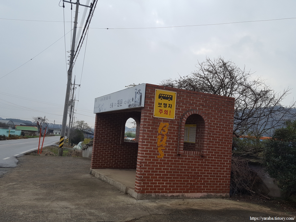 4코스를 끝낼 무렵 우리는 원문마을에 가면 식당이나 마트가 있을 것으로 기대했었다. 비를 주적주적 맞으며 흐린 들길을 걸었으니 따뜻한 국물에 맛있는 점심을 기대하는 것은 인지 상정이었다. 여행을 계획하면서 이곳이 읍내일 것이라고 생각한 필자의 착각이 이런 허망한 기대에 보탬이 되었다. 우수영 쪽으로 가는 버스가 지나는 곳이니 식당이나 편의점이 있을 거라고 막연한 기대를 했는지도 모르겠다. 그렇지만, 현실은 아무것도 없었다. 다행히 김밥이 있어서 버스 정류장에서 바람을 피하며 요기는 했지만 쌀쌀한 날씨에 몸을 녹여줄 국물을 옆지기에 상납하지 못한 것이 아쉬운 순간이었다.