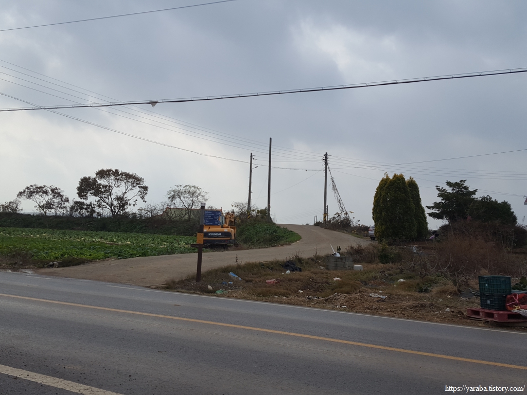 언덕 위 배추밭에서는 일군들이 모여서 배추 수확에 여념이 없는데, 우리는 진흙탕 길 앞에서 어찌할 바를 몰라 잠시 주춤했다. 다들 차를 몰고 다니니 물을 빼낼 여유도 없었나 보다. 잠시 주춤하다 도로 경계석을 조심스레 밟으며 길을 통과했다. 멀리 학동마을이 보이기 시작한다.