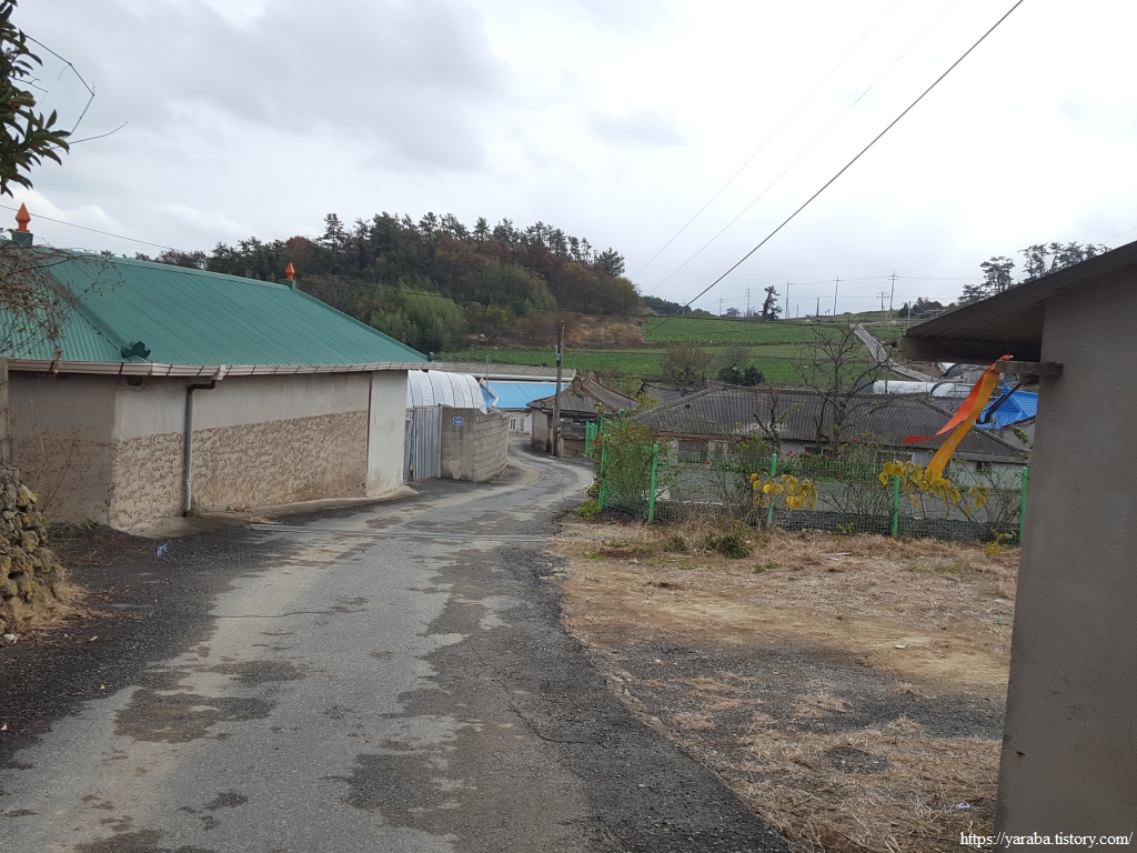 급한 볼일을 해결할 수 있었던 장포마을회관에서 볼일도 볼 겸 잠시 쉬어간다. 외부 화장실이 있는 마을 회관이 많지 않고, 있어도 잠그는 경우가 많은데 이곳은 열어 두셨다. 빗길에 신발에 묻은 흙자국을 화장실에 남기는 것이 미안했다. 마을 이름처럼 예전에는 포구였던 마을은 이제는 바다가 없다.