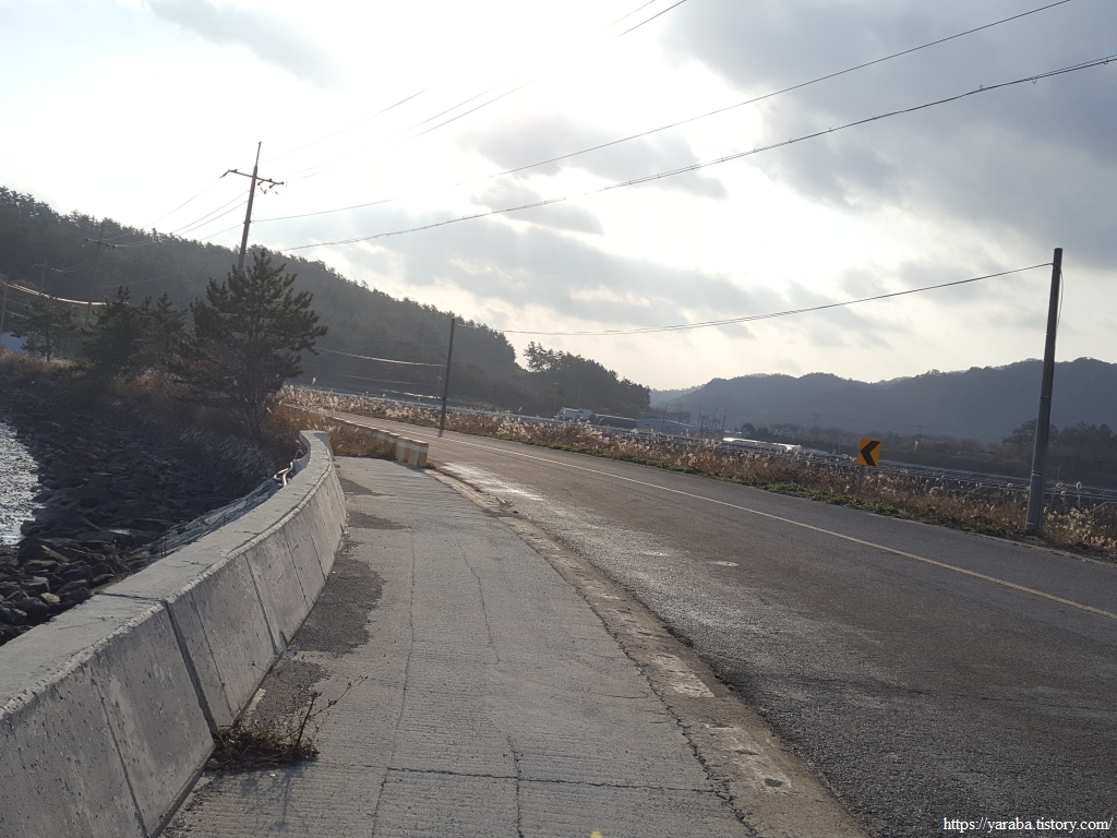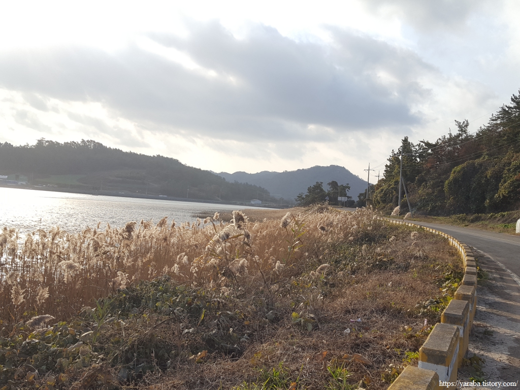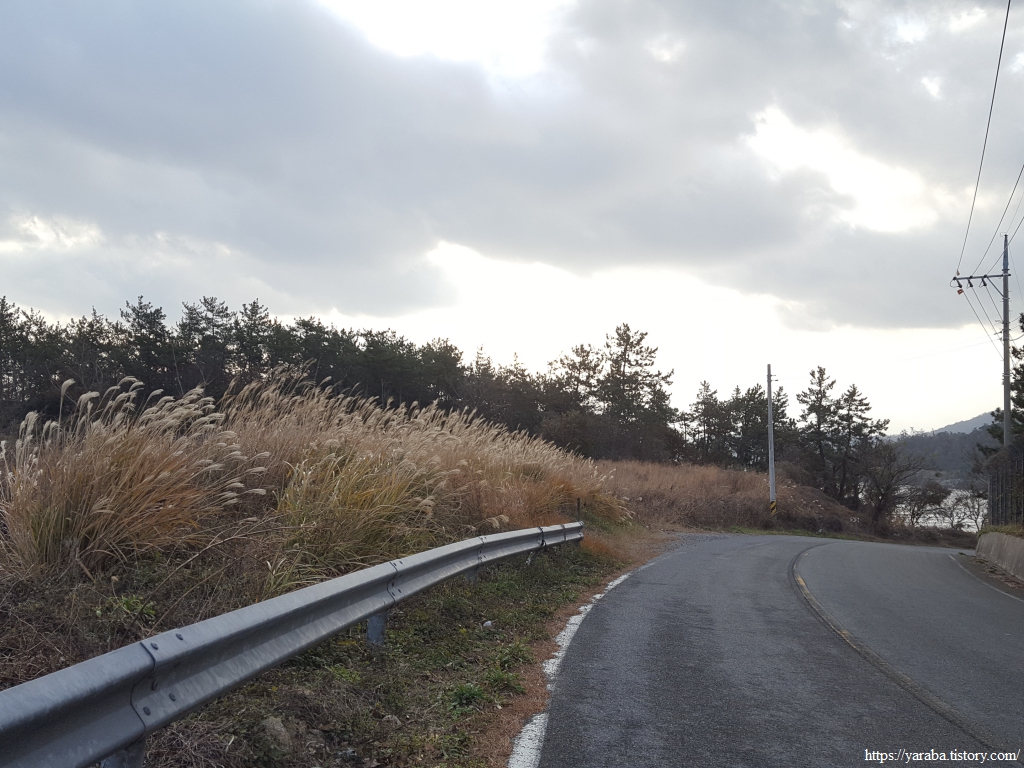 이른 아침부터 구름 가득한 하늘이었는데 날씨가 조금씩 개이면서 눈부신 아침 햇살이 비추기 시작한다. 날씨는 쌀쌀하지만 햇살을 정면으로 받는 가슴은 따스해진다. 아침 햇살을 받아 빛나는 해안 도로 옆에 억새밭과 은빛 바다도 아름답다.
