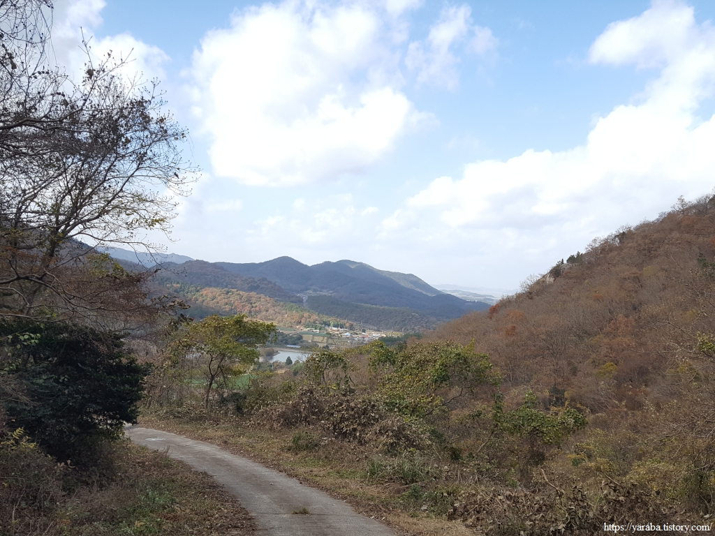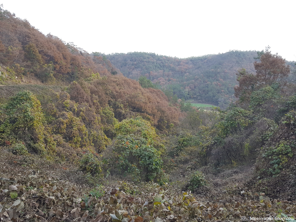 어느덧 고갯마루에 이른 모양이다. 지금까지 올라온 고개 아래를 돌아보니 깊은 계곡만 보일뿐 마을은 전혀 보이지 않는다.