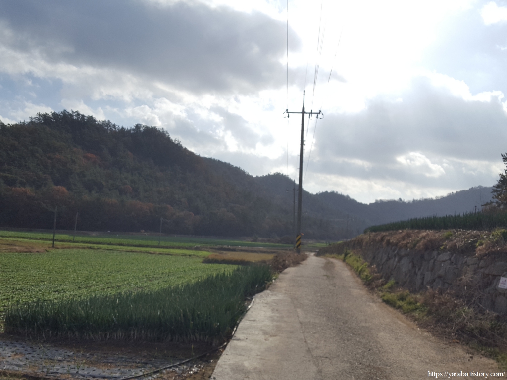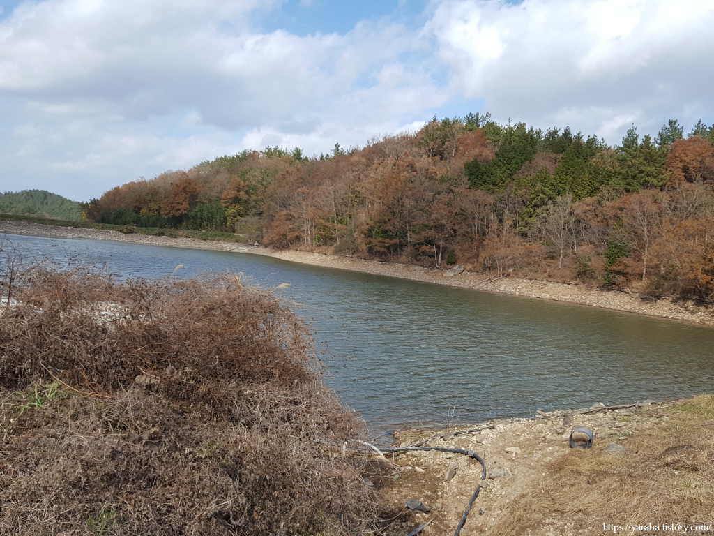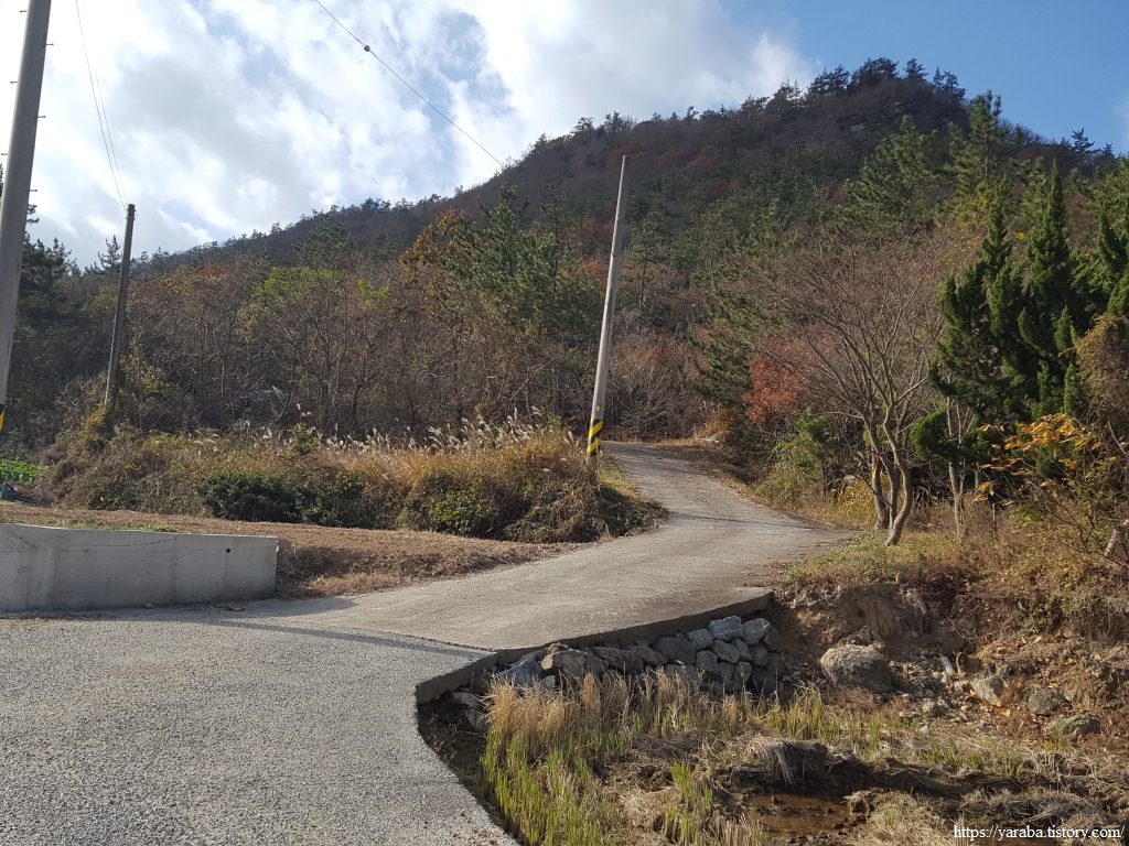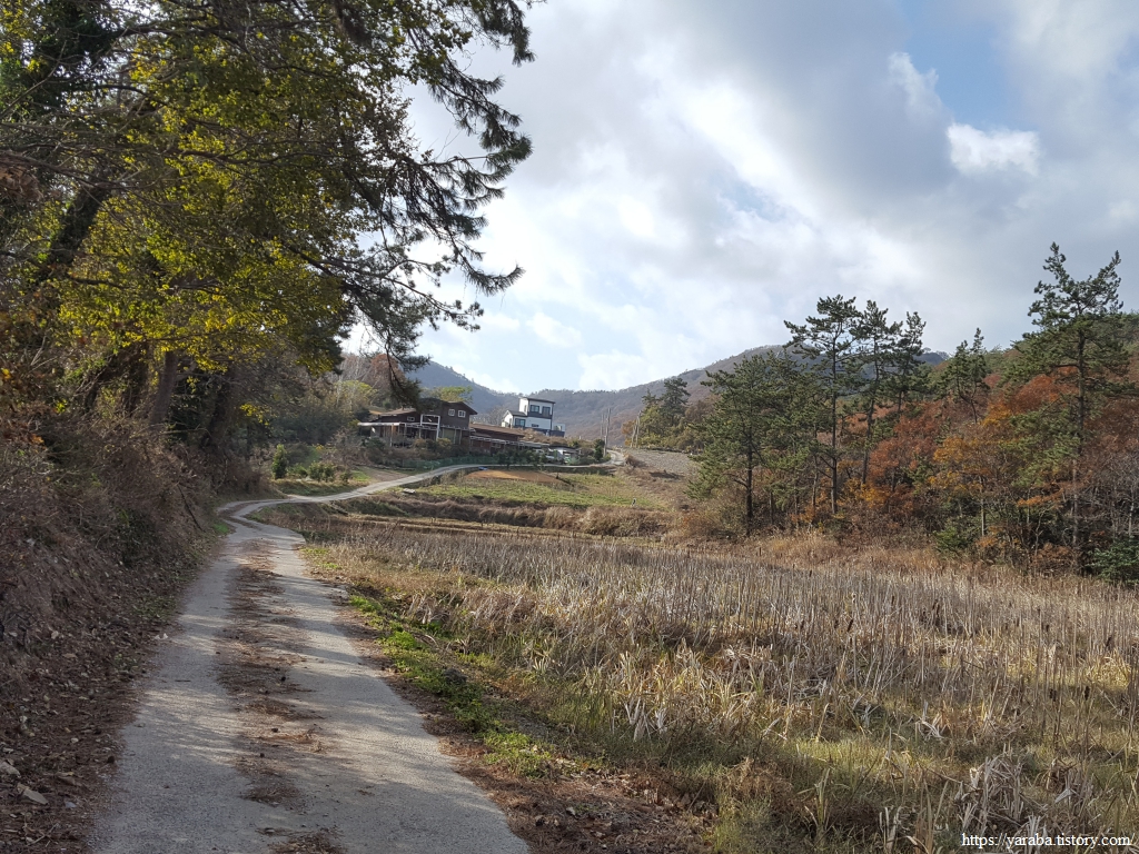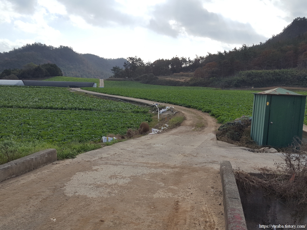 산 아래 용장제 저수지가 보이기 시작한다. 많이 내려왔다. 계곡을 건너는 다리를 지나면 산길이 끝나고 농지가 시작된다.