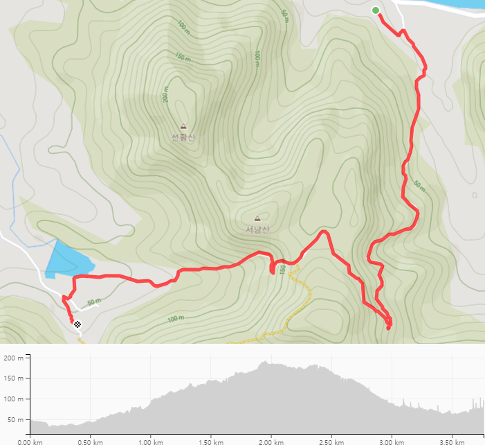 서낭산 고개를 넘어가는 길은 3.5Km의 구간으로 2백 미터까지 고도를 완만히 올리며 올라가고 고개를 넘으면 완만히 내려가는 구간이다. 전체 구간이 임도이므로 무리 없는 길이다.