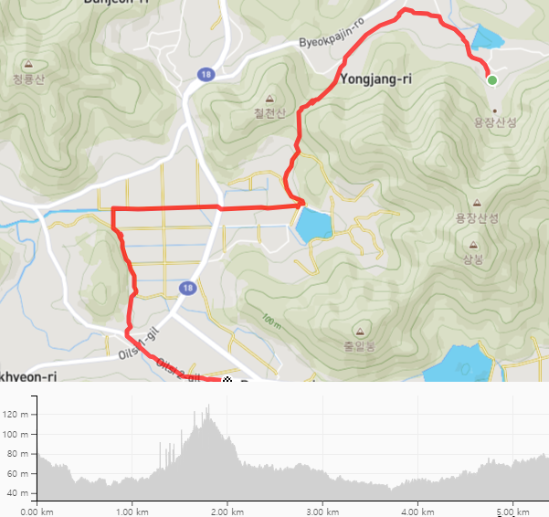 길은 작은 야산인 모종산 아랫자락을 따라 흐르는 개천을 따라 남쪽을 향해 내려가 읍내로 들어가는데 하수처리장 옆에 있던 쉼터에서 잠시 쉬었다가 걸으니 힘도 나고 남은 거리와 시간을 계산해 보면 느리게 걸어도 7코스를 완료하는 데는 문제가 없겠다는 생각이 든다. 몸이 마음 같지는 않지만, 아무것도 하는 없이 멍하니 앉아서 오랜 시간을 버스를 기다리는 것이 너무 아깝다는 생각이 마음을 지배하기 시작한다.