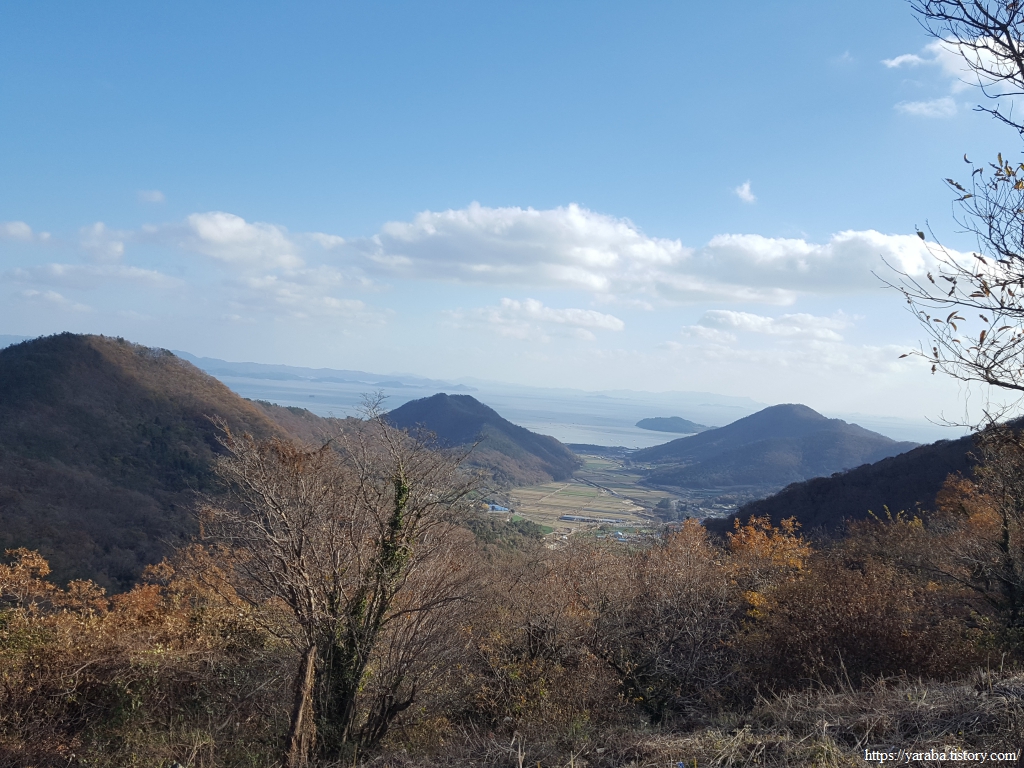 아직 고갯마루에 이르지는 못했지만 깊은 계곡은 벗어난 모양이다. 고군면의 들판과 상봉, 삼봉, 삼마산과 봉우리들이 시야에 들어온다.
