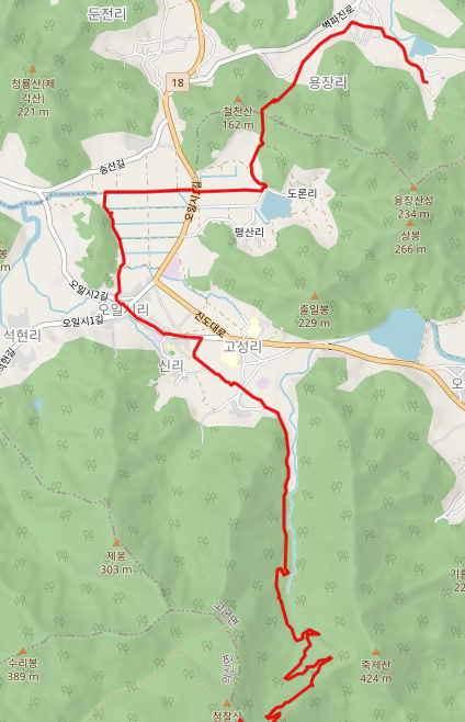 용장성을 떠나면 철천산과 상봉 사이의 성재 고개를 넘어 도평저수지에 닿는다. 이후로 군내면 송산리 농로를 가로질러 고군면 읍내로 들어간다 읍내 식당에서 백반으로 에너지를 보충한 다음에는 읍내를 빠져나와 고성 초등학교 인근에서 마을길을 거쳐 임도를 따라 죽제산과 첨찰산 사이의 계곡 안으로 들어간다.