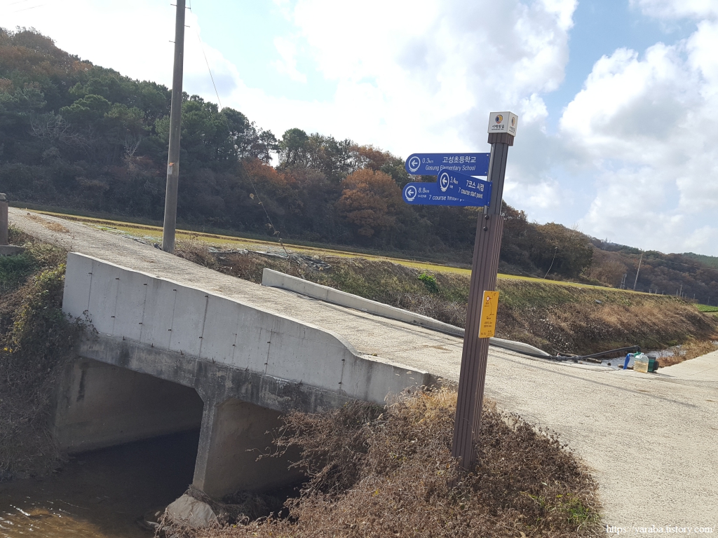 길은 고성초등학교에 이르기 전에 우회전하여 들길로 나가는데 들길에서 학교를 보니 완도에서 만났던 초등학교처럼 학교에 골프 연습 시설이 있었다. 전교생이 60명 조금 넘는 학교에서 방과 후 학습을 위한 골프 연습장을 가지고 있으니 오로지 입시에만 매달려 있는 도시 아이들이 불쌍하다.