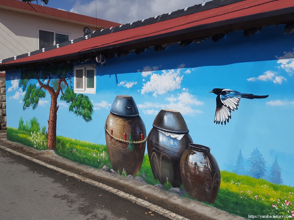마을 벽화를 만났는데 진짜 항아리를 둔 것처럼 보일 정도를 항아리를 실감 나게 그렸다. 사진으로 보아도 실제 항아리라고 착각이 들 정도이다.