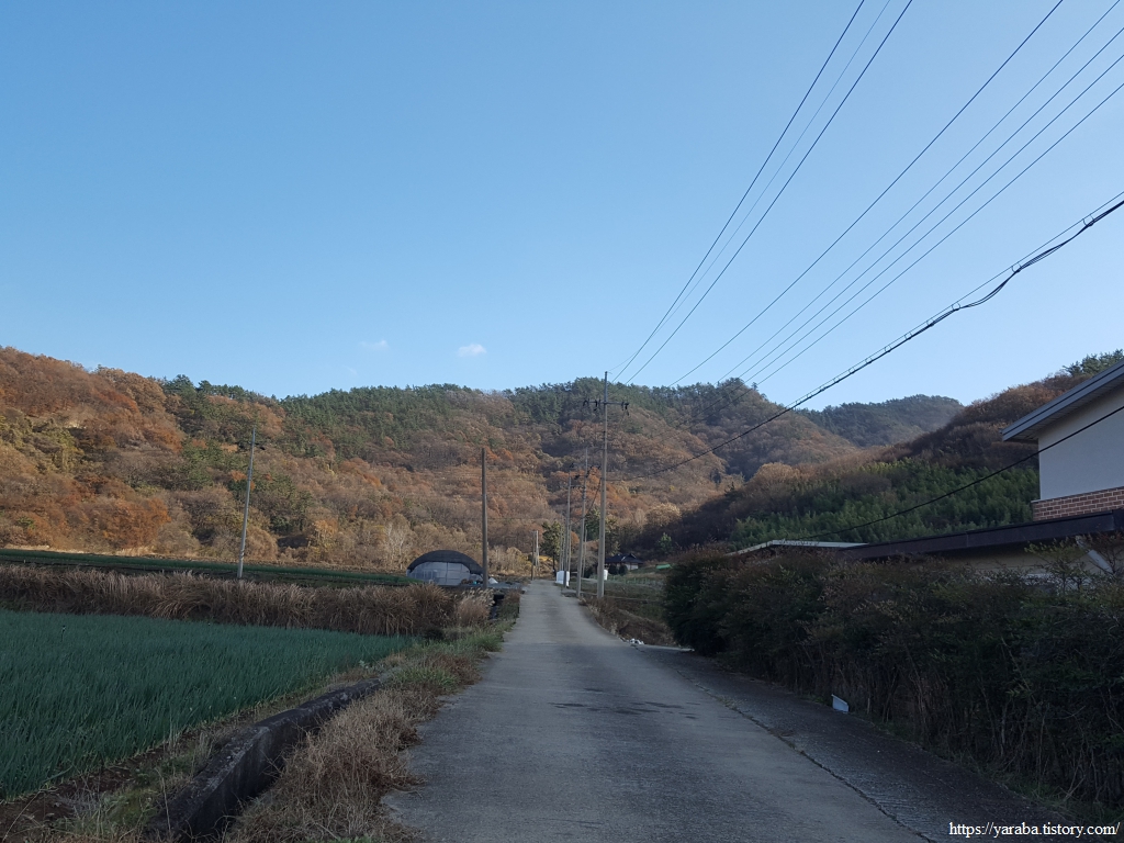 마을길 끝자락 칠천산 고개를 넘는 길로 진입한다. 시작 지점에서 1.1Km 진행한 지점이다.