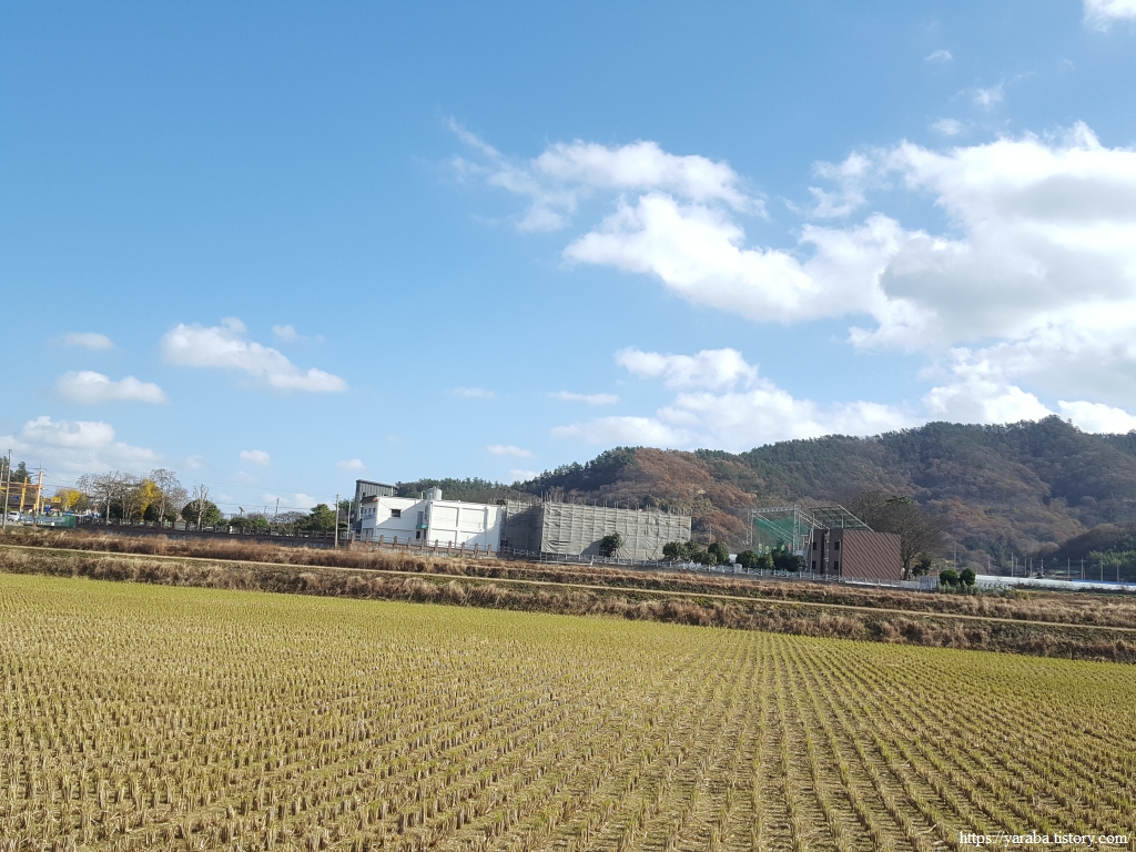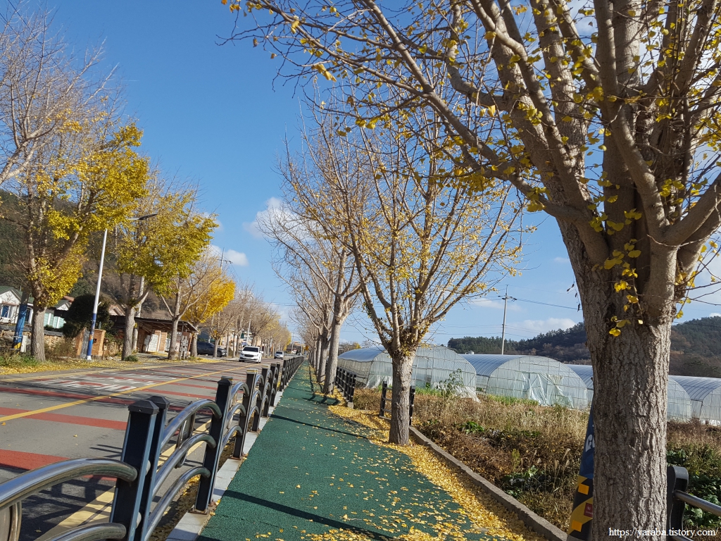 점심식사를 끝낸 우리는 고군면 읍내를 가로질러 고성초등학교 방향으로 이동한다. 고성초등학교로 가는 길은 노란 은행잎이 날리는 길이었다. 푸른 들판을 배경으로 보는 노란 잎을 가진 은행나무도 아름답다.