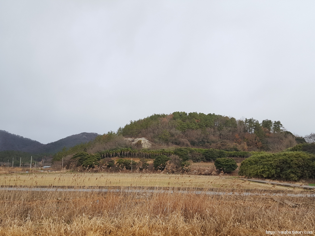 송정지 저수지로 가는 길에 들판 너머로 독특한 광경이 눈길을 사로잡는다. 야트막한 야산에 커다란 바위가 드러나 있는데 바위 아래로 야자수를 울타리처럼 줄지어 심었고 그 아래로 묘소를 마련한 모습이었다. 묘소 주위로 소나무를 심는 것은 보았어도 야자수라니...... 사연과 배경은 모르겠으나 우리나라에서는 가로수로 드문드문 만나는 야자수를 야산에서 만나니 아무튼 특이한 풍경이었다.