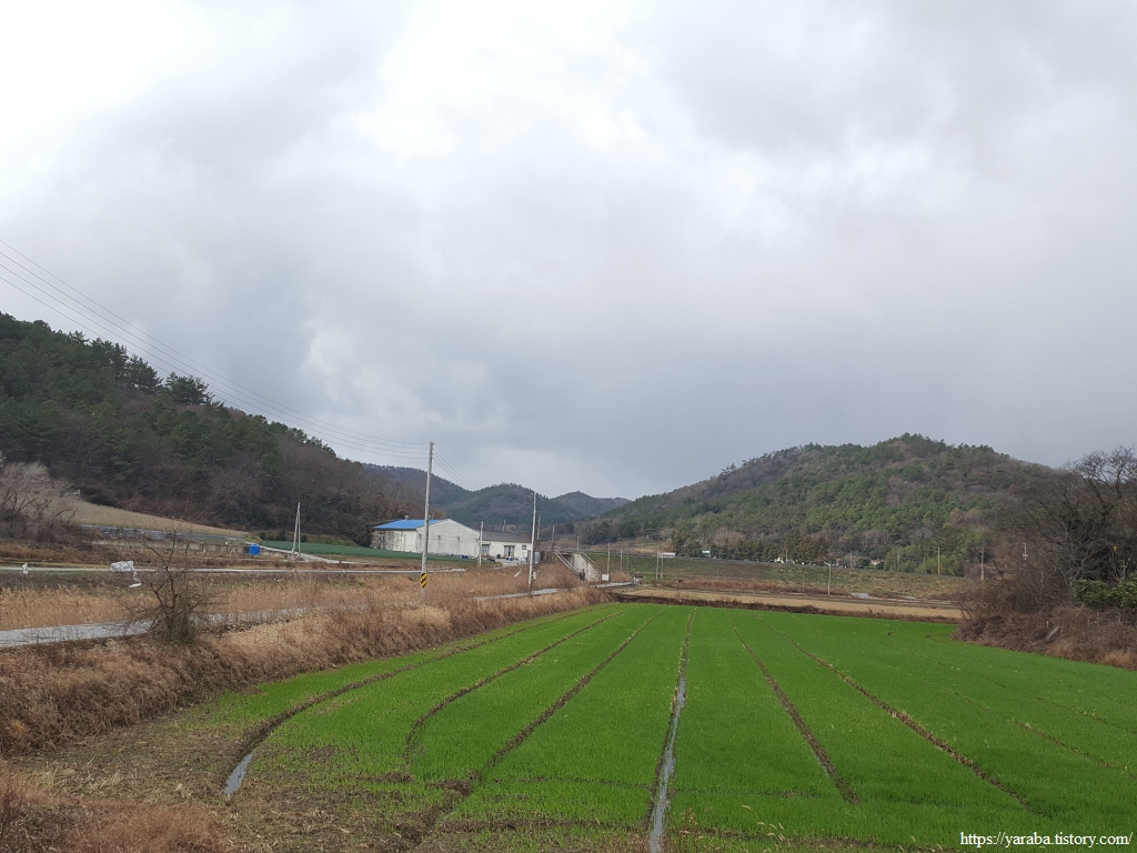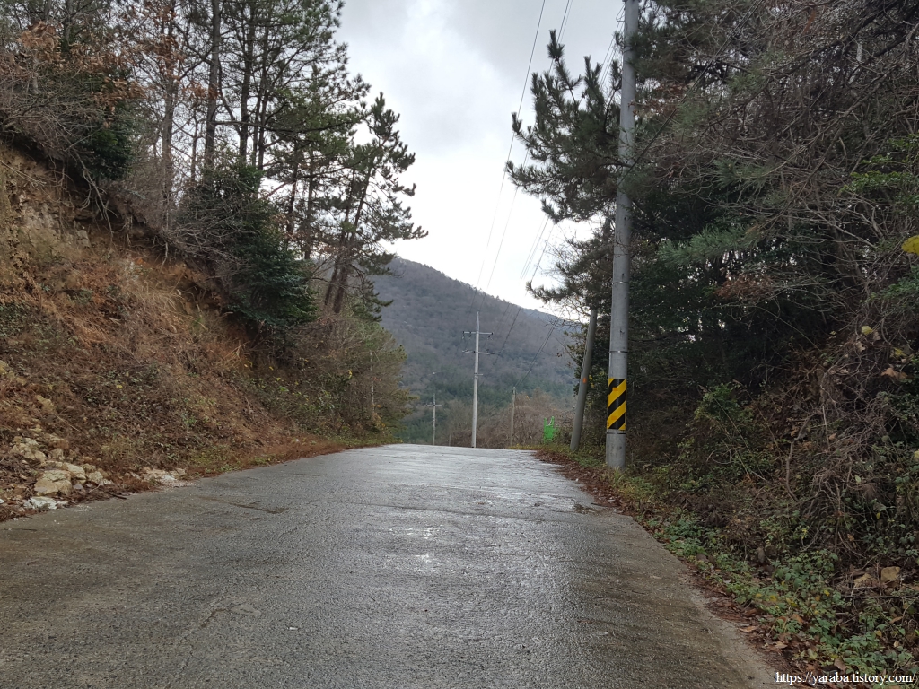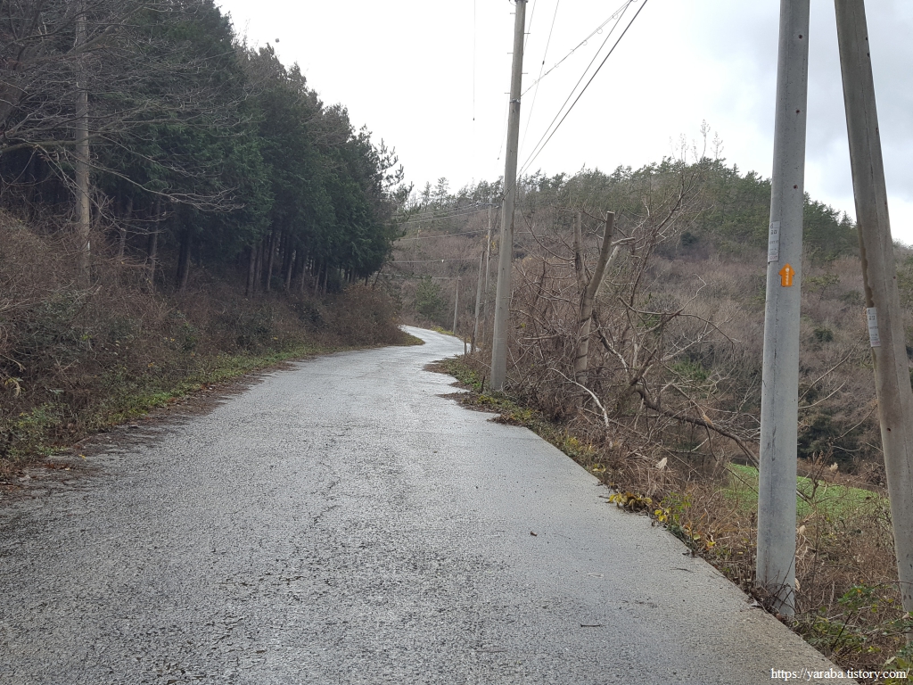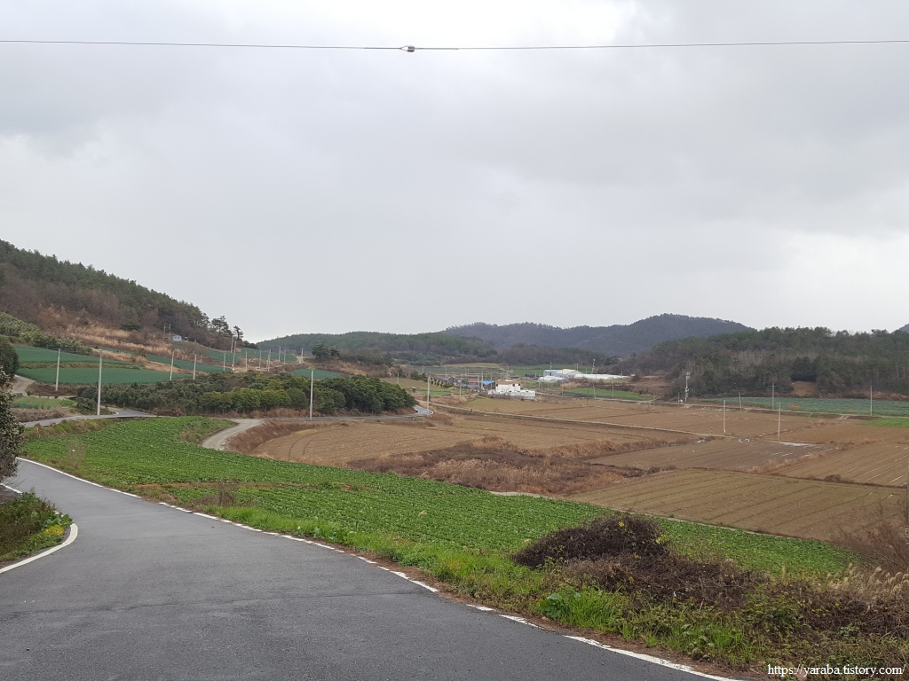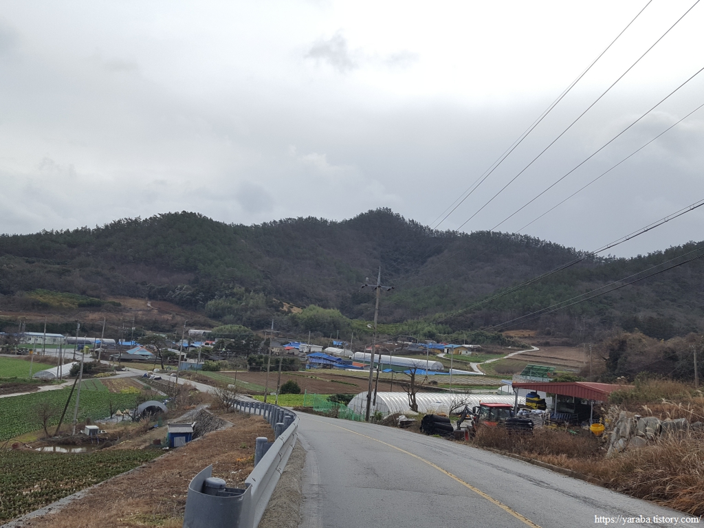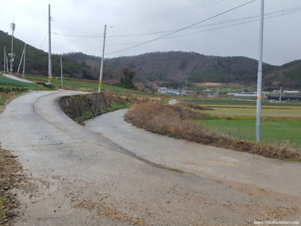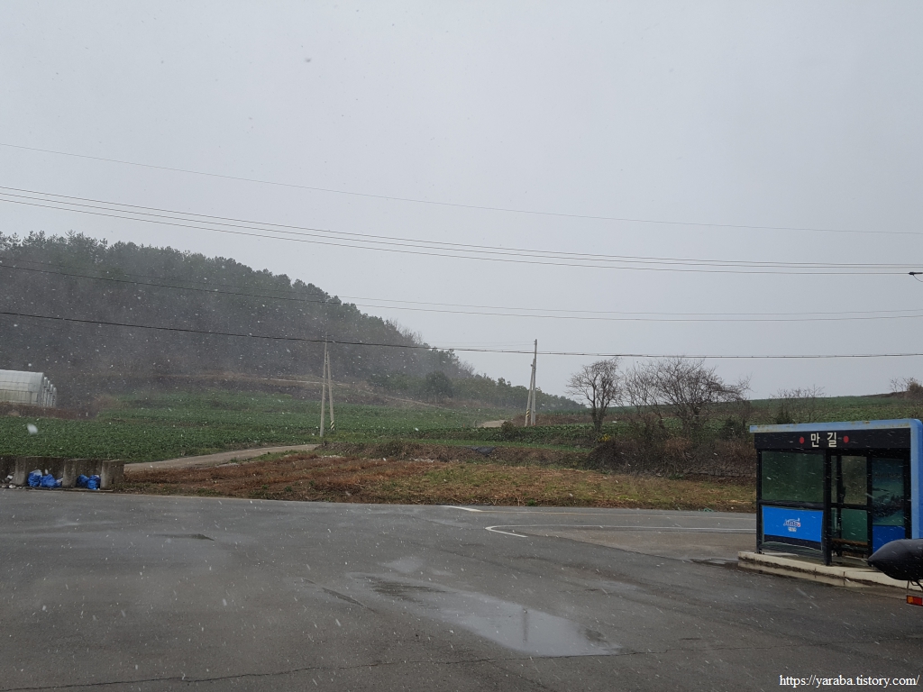 송정리를 빠져나오면 원래의 서해랑길은 매실로 도로를 가로질러 농로를 통해서 매듭재 고개로 향하지만 우리는 그만 서해랑길 표식을 놓치고 말았다. 그도 그럴 것이 강한 바람과 함께 정면으로 얼굴을 때리는 진눈깨비를 피한다고 고개를 숙이고 걸었으니 농로 중간 꺾이는 지점에서 서해랑길 표식이나 리본을 놓친 모양이다. 결국 죽청마을을 거쳐서 가야 했다. 그렇지만, 전화위복이라고 한동안 휴식을 취할 장소를 찾지 못했는데 죽청마을 버스정류장에서 잠시 휴식을 가질 수 있었다. 다만, 엉덩이가 따뜻한 버스 정류장 의자가 그리웠다. 차가운 바람은 조금은 피할 수 있었지만 경주, 울진 해파랑길에서 만났던 뜨끈한 버스 정류장 의자가 그리운 것은 사실이었다.