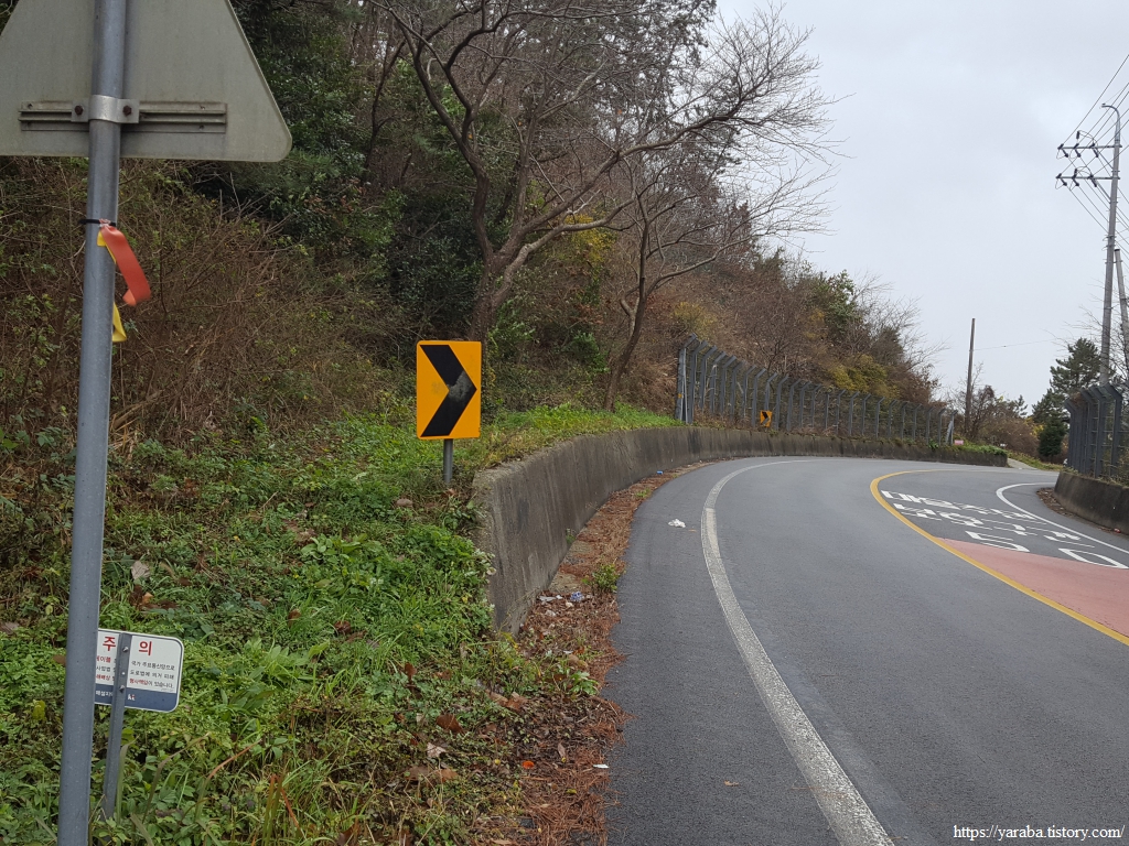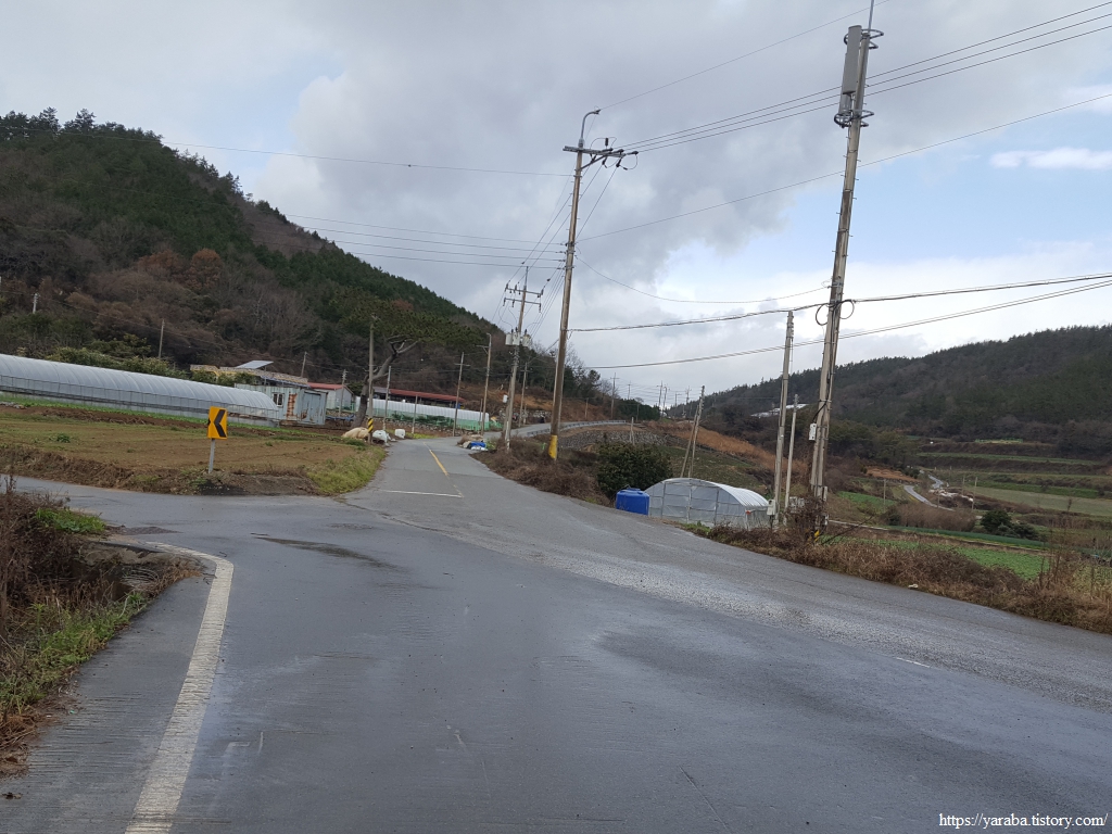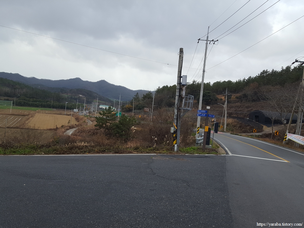 저수지 끝자락에서 길은 진도대로 도로를 가로질러 간다.