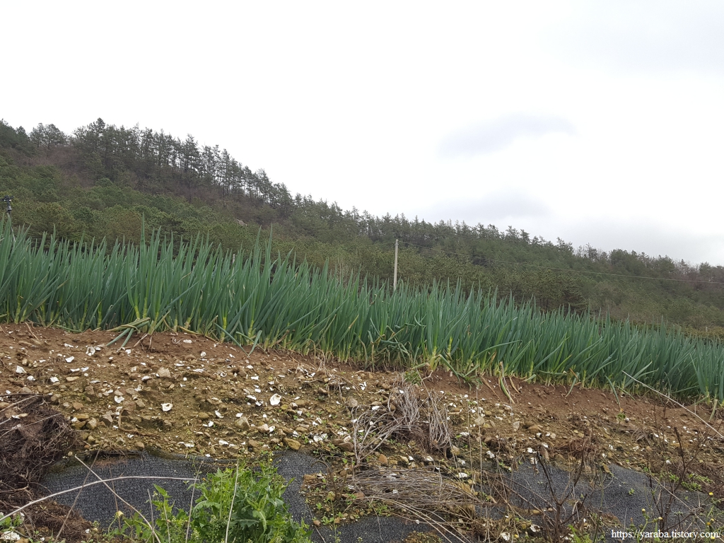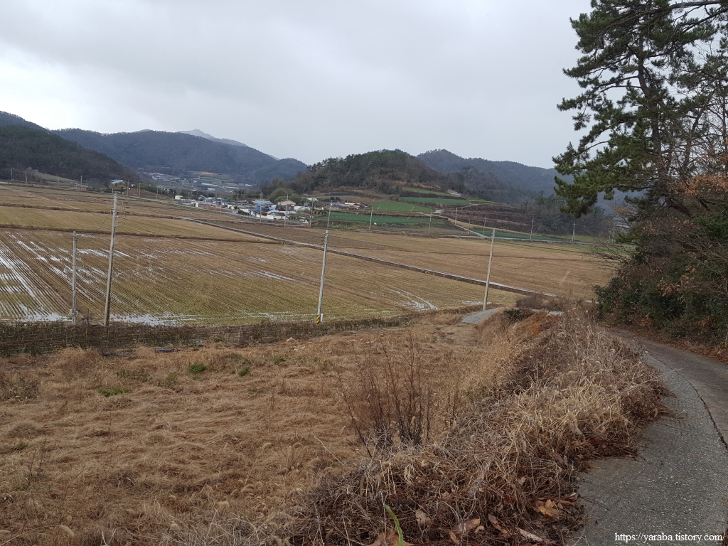 오르막길에서 내려다본 전경, 멀리로는 송정지가 보이고 바로 앞으로는 산자락에 자리한 죽청마을이 시야에 들어온다. 산자락을 일구어 배추와 대파를 심으며 자식들을 키워 냈을 이 땅의 어머니, 아버지들을 생각해 본다.