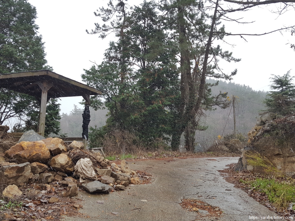 계곡을 지나는 도로를 걸어서인가? 잠시 잠잠하던 눈보라는 길이 고갯마루에 올라서자 다시 우리의 시야를 가리기 시작한다. 길은 탑립마을로 이어지는 작은 도로를 따라 이동한다.