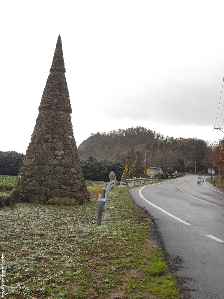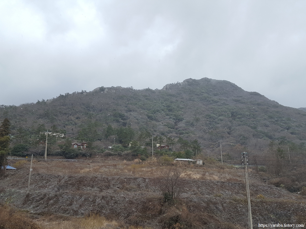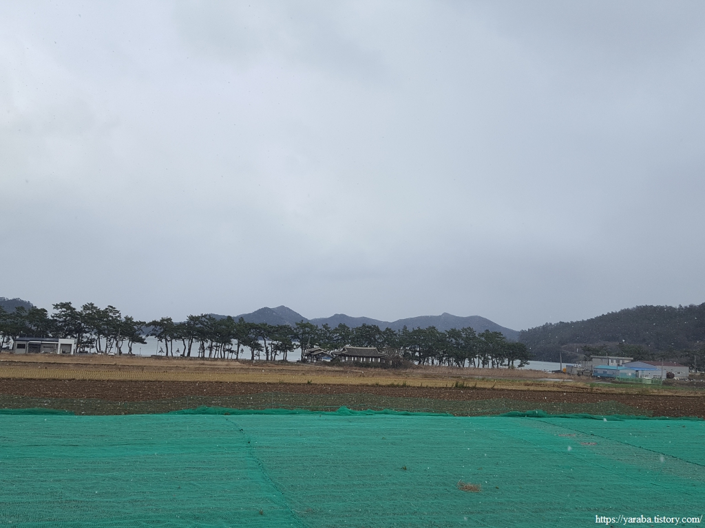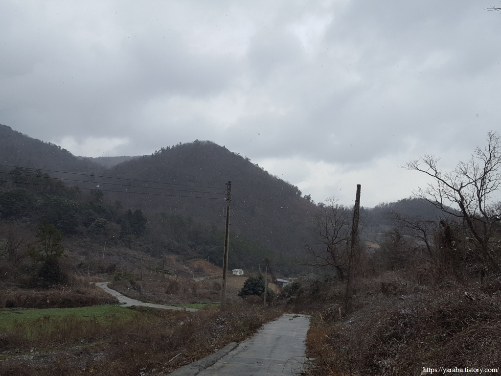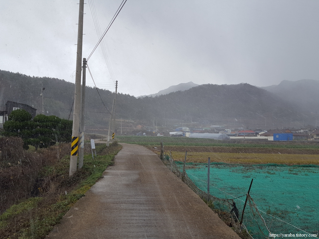 도로를 따라 서서히 여귀산 자락을 오르는 길, 날은 흐려도 높은 곳에서 내려다보는 죽림마을과 앞바다 풍경이 일품이다. 강한 바람과 눈보라는 몰아쳤다, 쉬었다를 반복한다. 하늘을 올려다보면 시커먼 먹구름이 몰려올 때면 멀리서부터 눈발이 비처럼, 안개처럼 흩어지기 시작하고 어느새인가 눈발이 우리의 얼굴을 때린다.
