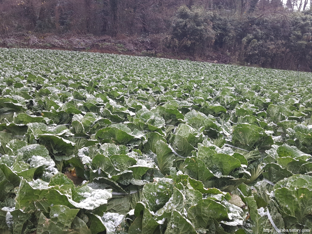 길은 다시 국도와 합류한다. 이곳의 풀밭에 내린 눈들도 녹지 않고 쌓이기 시작했다. 오묘한 우연일까? 운명과 같은 우연일까? 도로변에 세운 김미경 시인의 "겨울 배추와 첫눈"이라는 시비를 만났다.