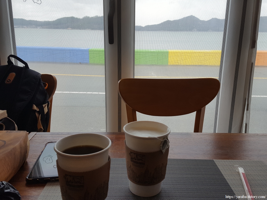 비와 진눈깨비가 적셔 놓은 땅에 추운 날씨가 겹쳐서 쉴 곳도 마땅치 않았지만 휴식 시간이 적었는지, 출발 지점 이후로 이곳까지 이동한 속도가 상당했다. 덕분에 뜨거운 커피 한잔 하며 쉬어갈 여유도 생겼다. 디저트를 함께 주문했는데 사람이 많이 없어서 인지 디저트는 준비가 되지 않았다고 한다. 주인장에게 김밥을 먹어도 되냐고 물으니 그러라고 한다. 뜨거운 커피와 배낭에 남아 있던 김밥을 먹으며 꽁꽁 얼어 버린 몸을 녹이니 참 좋았다. 문제는 창밖 풍경이었는데 쏟아진 진눈깨비를 강한 바람이 이리저리 쓸고 있었다.