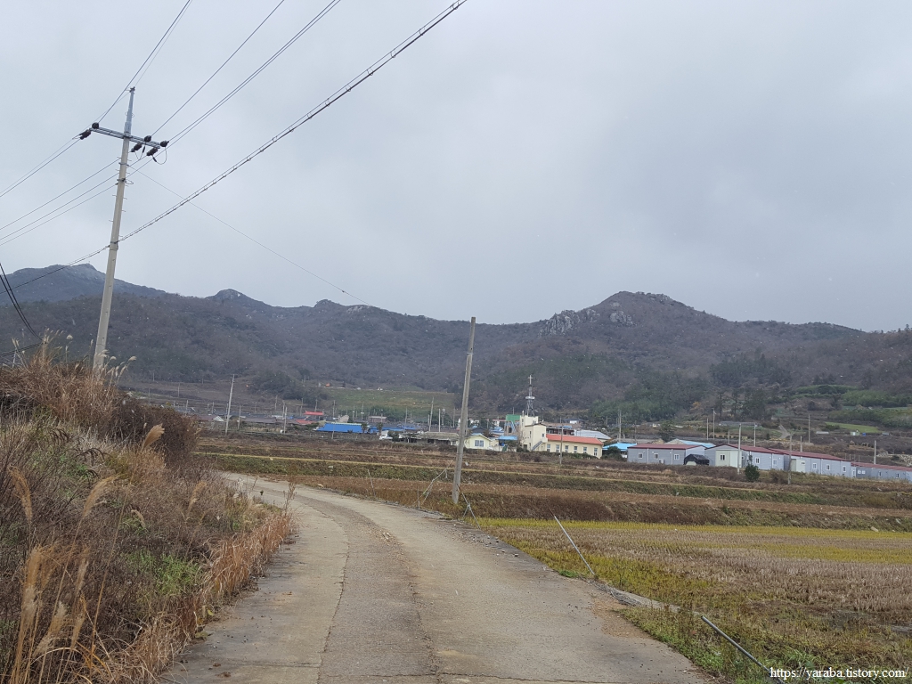 죽림마을 북쪽으로는 작은 저수지와 여귀산 자락의 암봉이 마을을 바라보고 있었다.