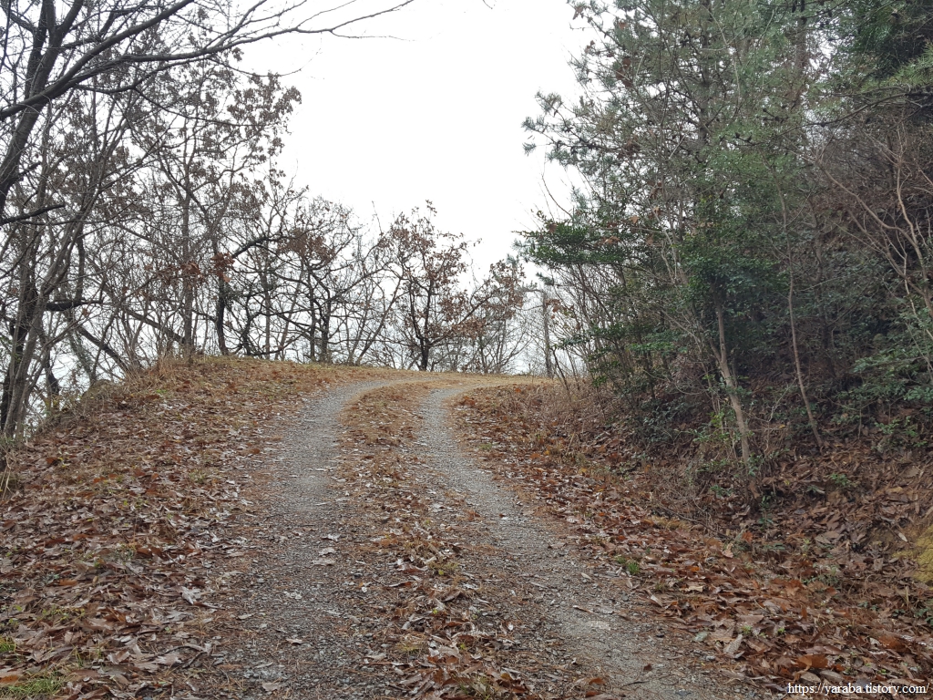 보덕산 임도를 따라 산 중턱을 완만하게 내려가는 길, 능선 반대쪽이라 그런지 바람이 많이 불지 않는다. 계속 이런 길이 이어지는 것은 아니겠지만 잠시나마 바람이 잔잔한 길을 걸으니 좋다.