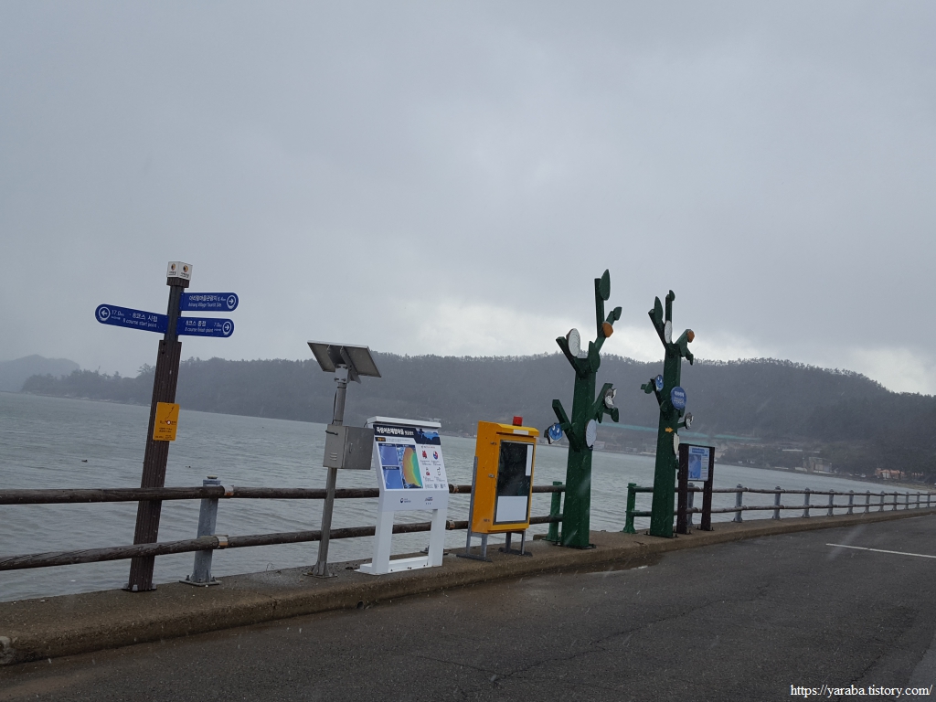 해안 끝자락에 있는 동헌마을로 들어가는 교차로에 있는 마을은 죽림 어촌 체험마을로 독살도 있고 조개잡이 체험장도 있지만 마을 갤러리와 카페들도 있었다. 바람이 엄청 세게 불고 있지만 먼바다를 막고 있는 접도 덕분일까 앞바다는 잔잔한 호수 같다.