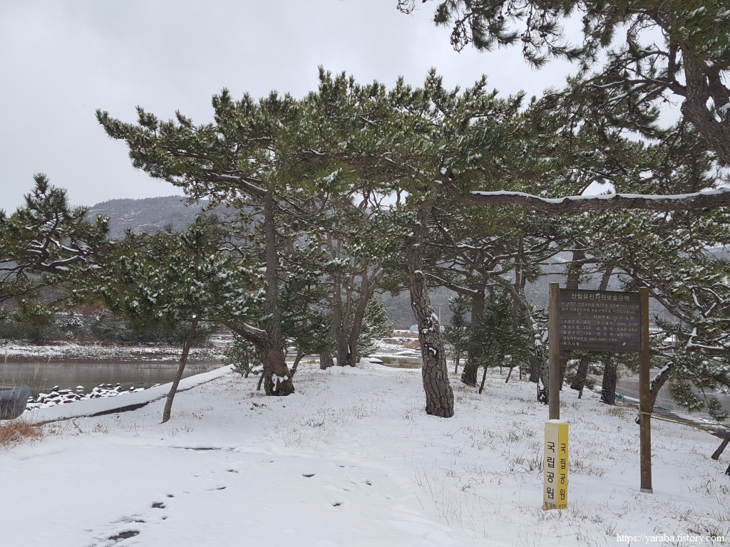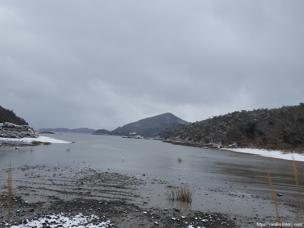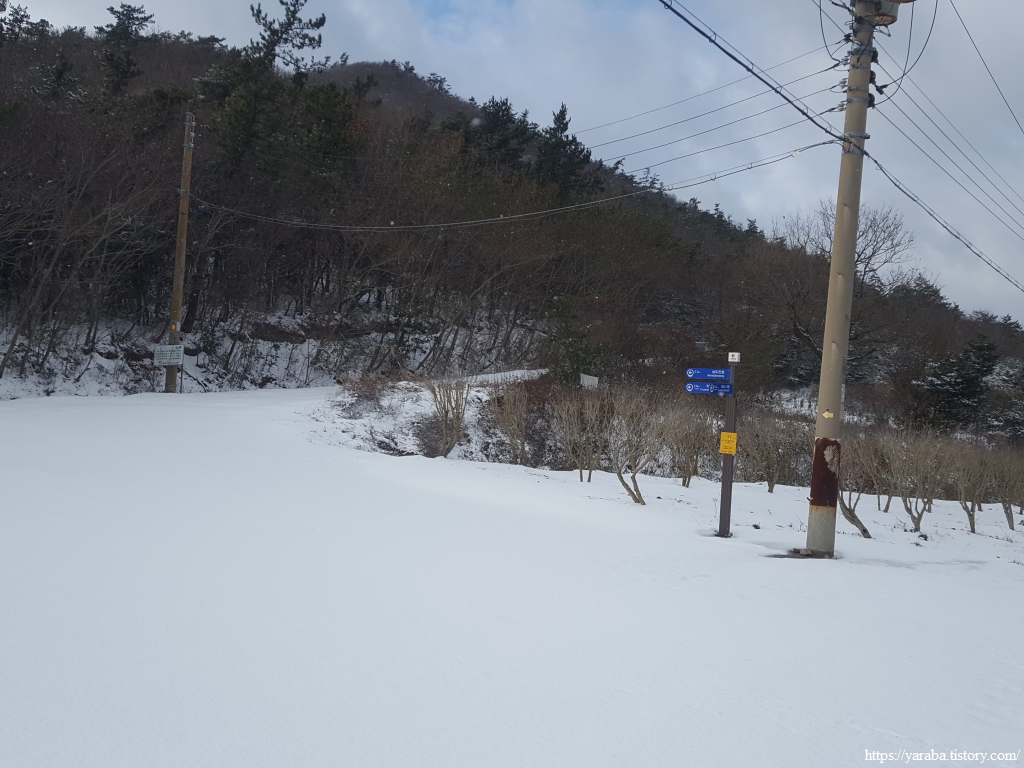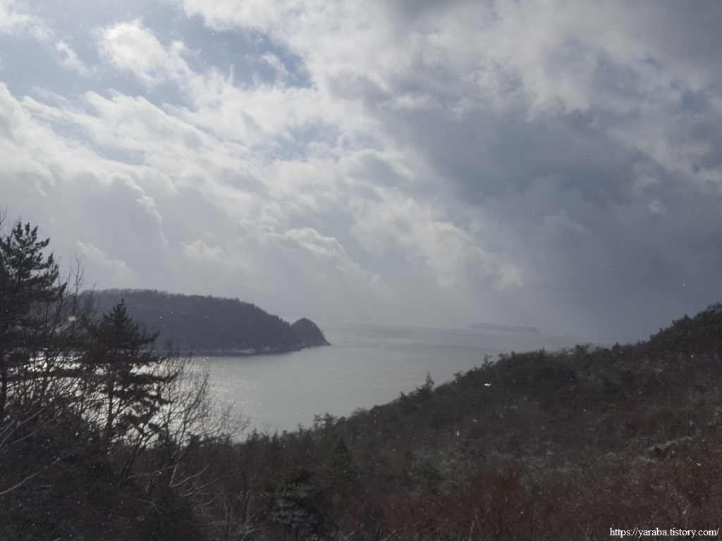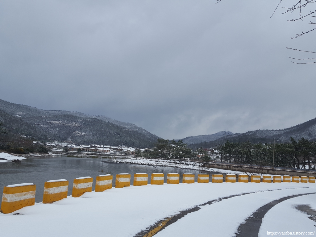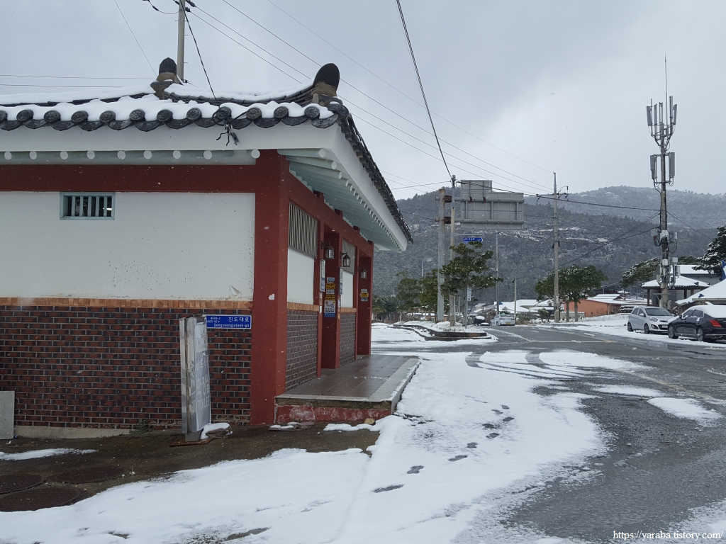 길은 국립진도자연휴양림 입구와 동령개마을 입구도 지난다. 여전히 흩날리는 눈은 딱딱한 눈이었다가 부드러운 눈으로 내리기를 반복한다. 아마도 대기 온도에 따라 달라지는 모양이다. 도로 옆 버스 정류장에서 잠시 쉬어 간다. 따뜻한 온기는 없지만 정류장에 문이 있어 바람을 막아주니 그나마 고마웠다.