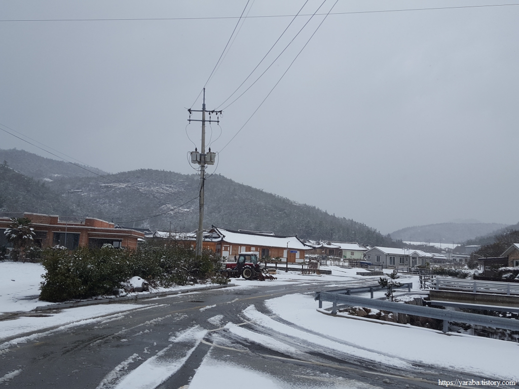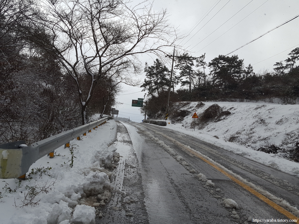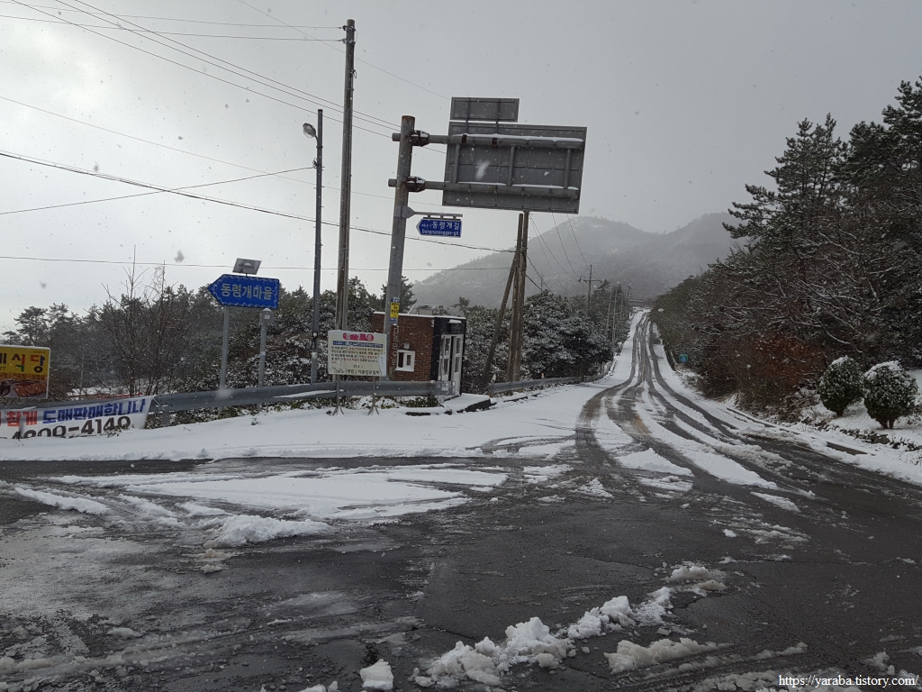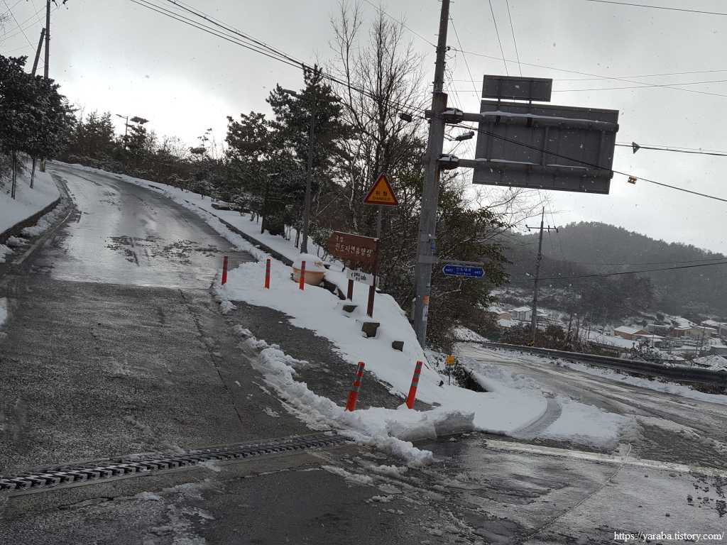 진도대로 도로를 따라 남동마을을 빠져나간다. 차가 많이 다니는 곳은 눈이 많이 녹았지만 여전히 도로 갓길로 이동하기는 어렵다. 앞뒤로 차가 오는지 눈으로 귀로 확인하면서 도로를 걷다가 옆으로 잠깐 피했다가를 반복한다.
