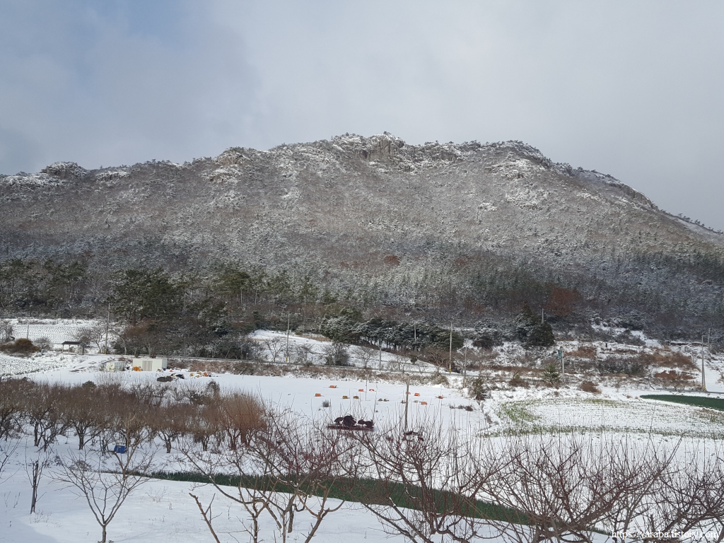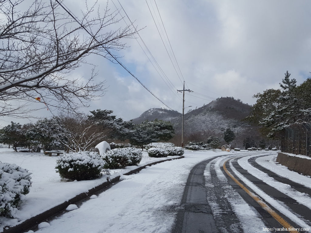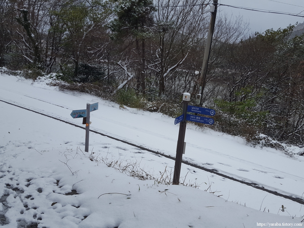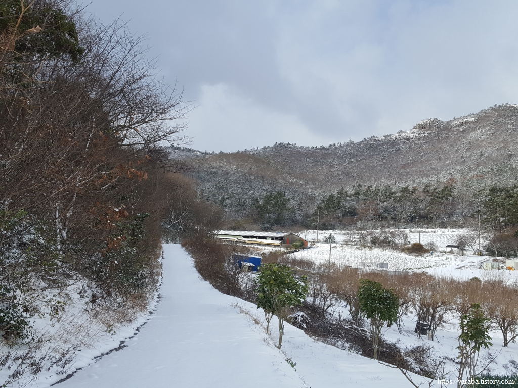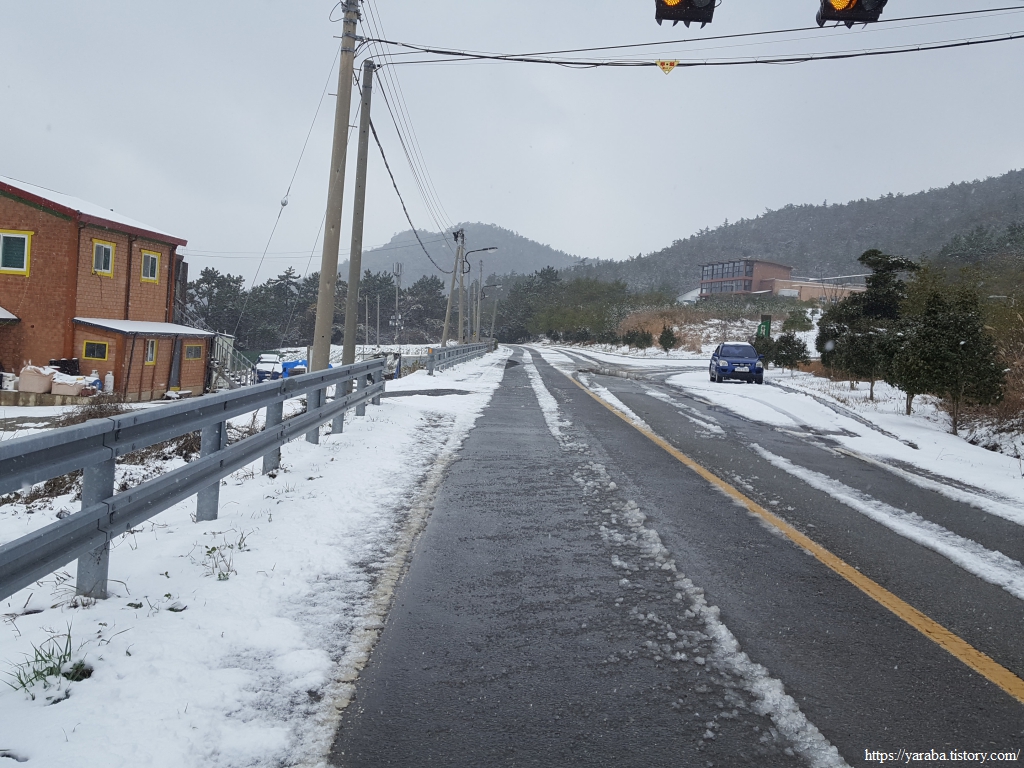 진도대로 도로를 따라 남동마을을 빠져나간다. 차가 많이 다니는 곳은 눈이 많이 녹았지만 여전히 도로 갓길로 이동하기는 어렵다. 앞뒤로 차가 오는지 눈으로 귀로 확인하면서 도로를 걷다가 옆으로 잠깐 피했다가를 반복한다.