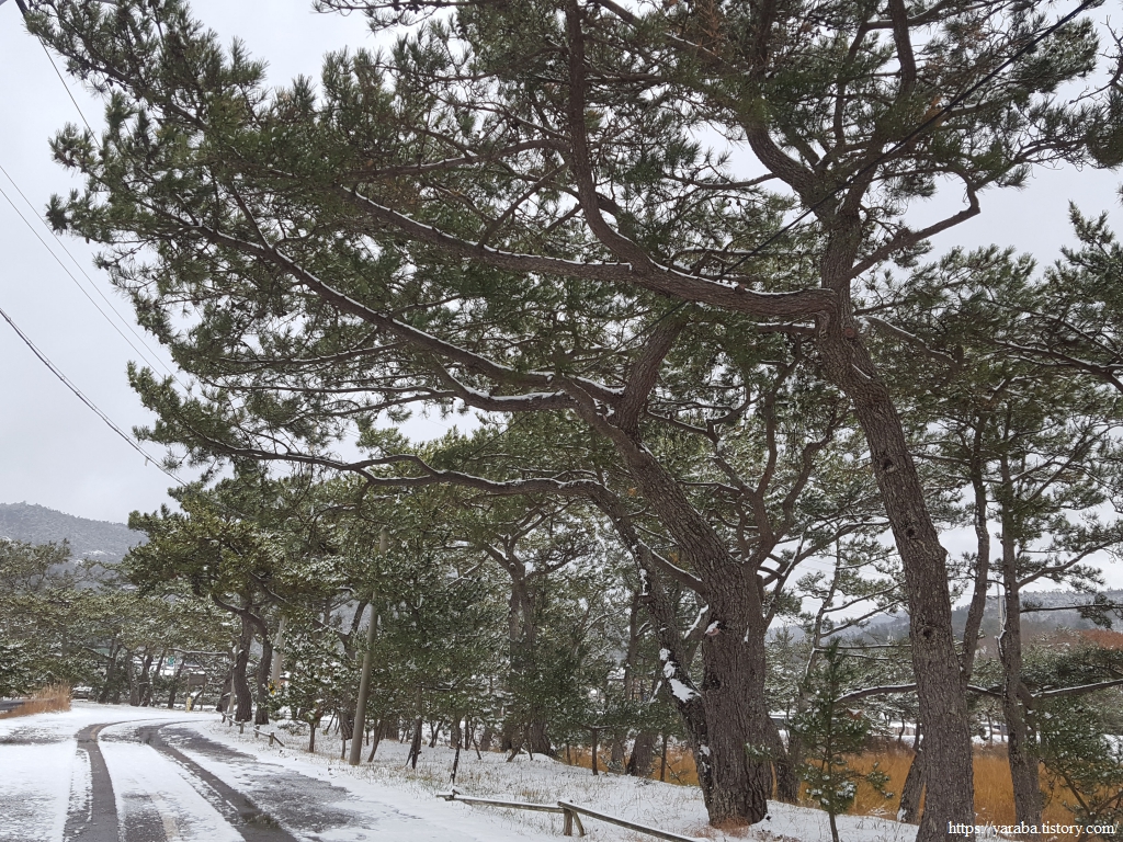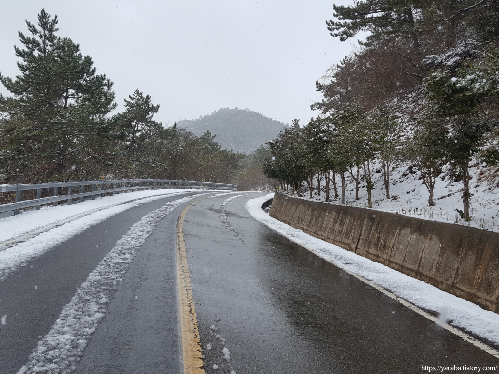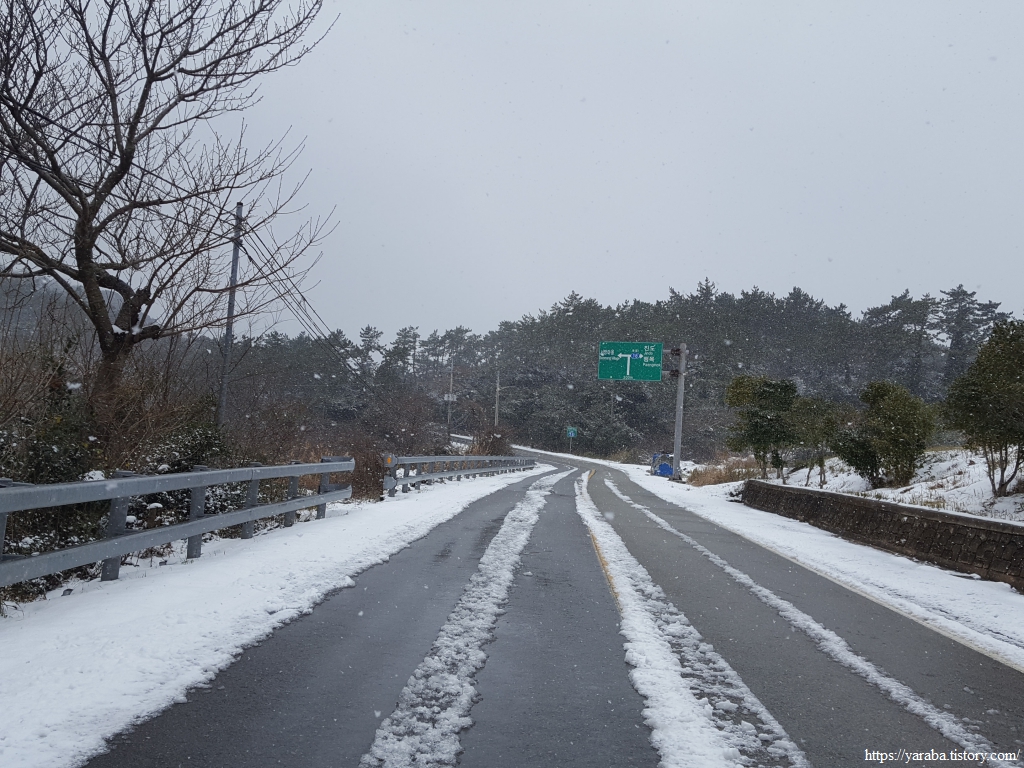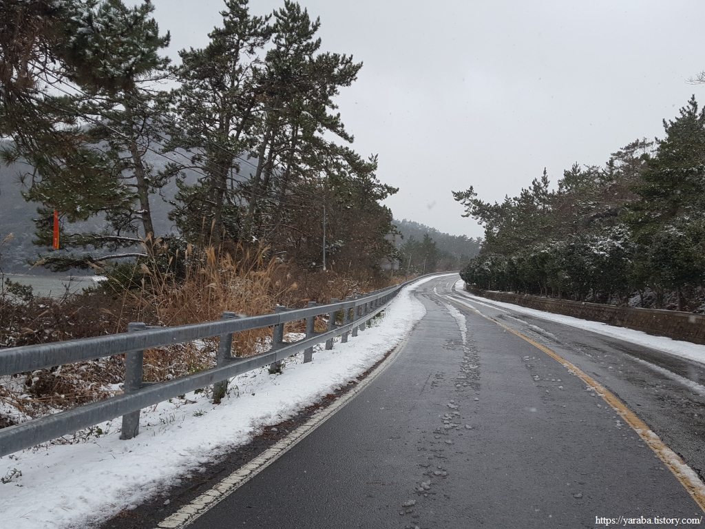 여전히 쏟아지는 눈을 맞으며 서망항을 향해 뚜벅뚜벅 걸어간다. 차가 거의 없는 도로를 걷지만 시야가 확보되지 않는 곡선 구간에서는 조심해야 한다.
