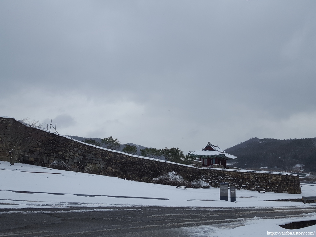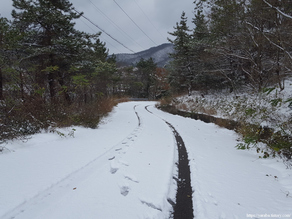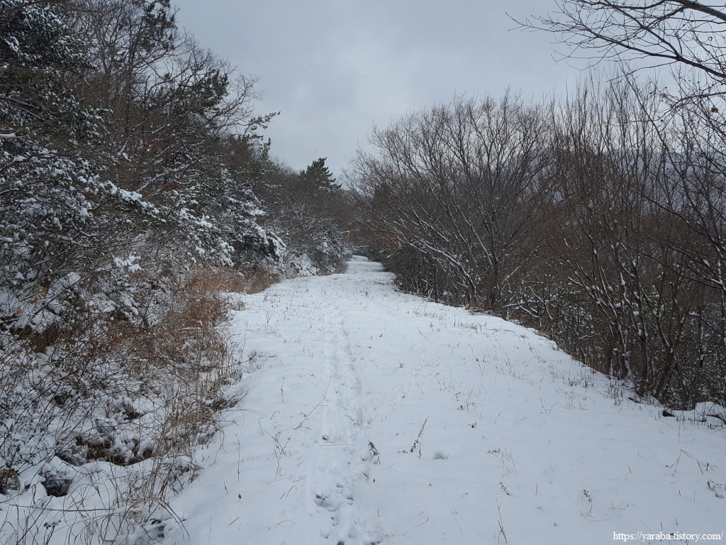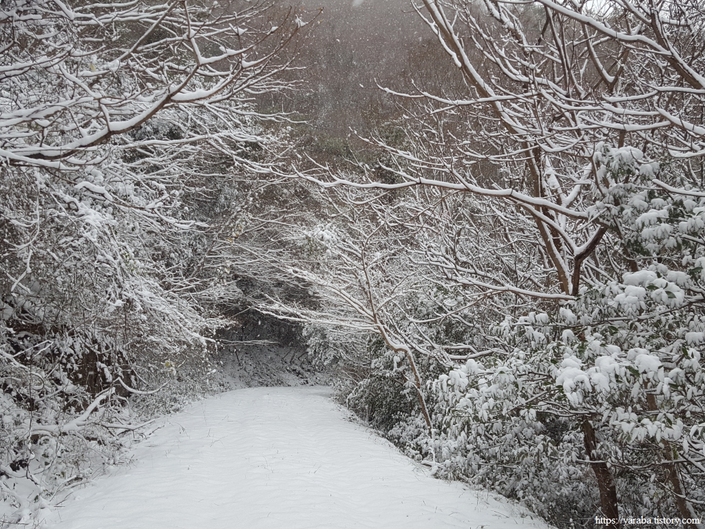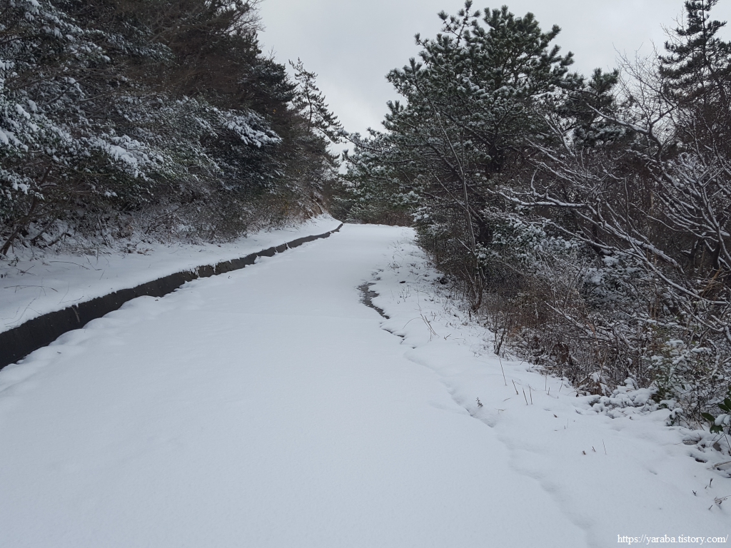여전히 쏟아지는 눈을 맞으며 서망항을 향해 뚜벅뚜벅 걸어간다. 차가 거의 없는 도로를 걷지만 시야가 확보되지 않는 곡선 구간에서는 조심해야 한다.