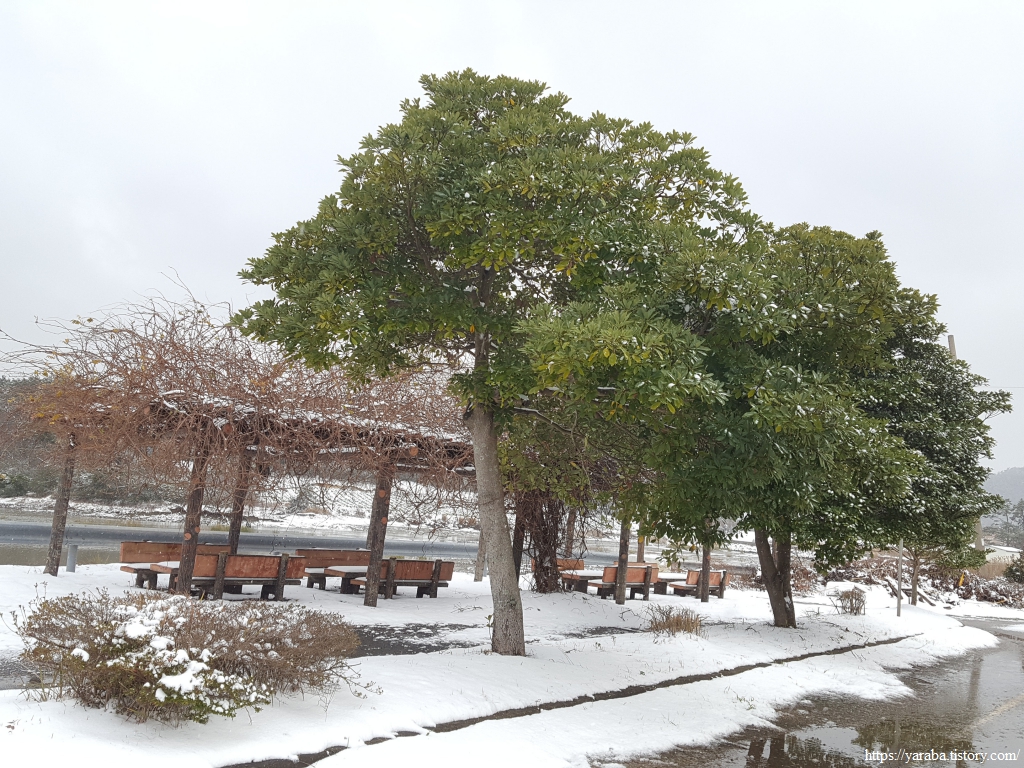 포근한 눈 담요를 망가뜨리는 것 같아 발자국을 남기며 지나가는 것이 아까울 정도다. 개인적으로 백설기를 좋아하는데 눈밭에 떨어진 나뭇잎들이 마치 떡 위에 올려놓은 떡고명처럼 보인다.