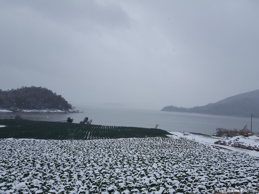 길을 걸으며 바라본 남도포 앞바다의 모습. 눈 덮인 대파밭과 배추밭에 시선이 간다. 배추가 눈을 맞으면 달아진다고는 하는데 상품으로 출하하는 데는 문제가 없을지 모르겠다.