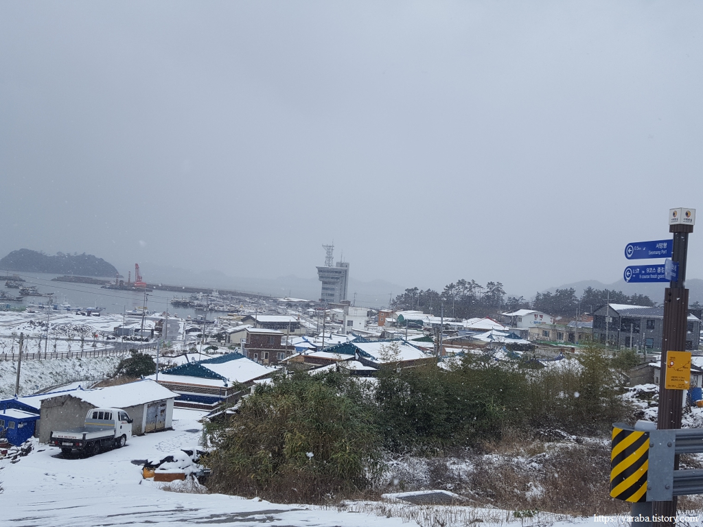 어느새인가 서망마을 표지판이 등장하더니 언덕 아래로 눈 덮인 서망항이 보이기 시작한다.