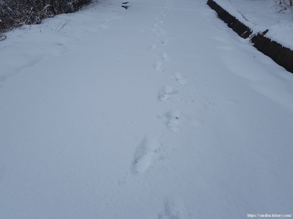 하산길에서는 한 사람과 한 마리의 견공 발자국을 만났다. 셜록 홈즈가 된 것처럼 그들이 발자국을 관찰하며 그들이 움직인 경로와 방식을 추적하며 길을 걷는다. 눈이 많아 힘들었는지 임도 중간에서 길을 돌린 모양이다. 개 발자국 크기가 작지 않은, 아마도 진돗개인 모양이다. 주인 양쪽을 자유롭게 오가면서 나름의 즐거운 산책길을 걸은 모습이다. 상상하면 새눈을 밟는 주인의 즐거움과 눈밭에서 신난 개의 모습에 나도 미소가 지어진다.