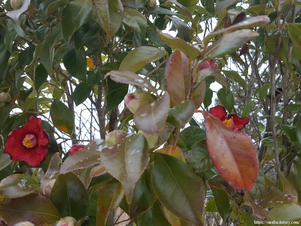검은 아스팔트와 하얀 눈, 흐린 하늘 속에서 지루할 수도 있는 걷기 여정을 도로변 동백이 생기를 부어준다.